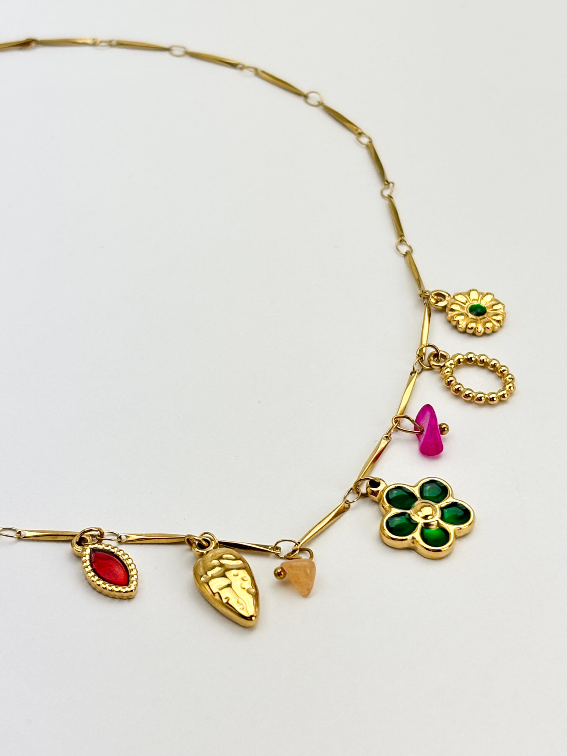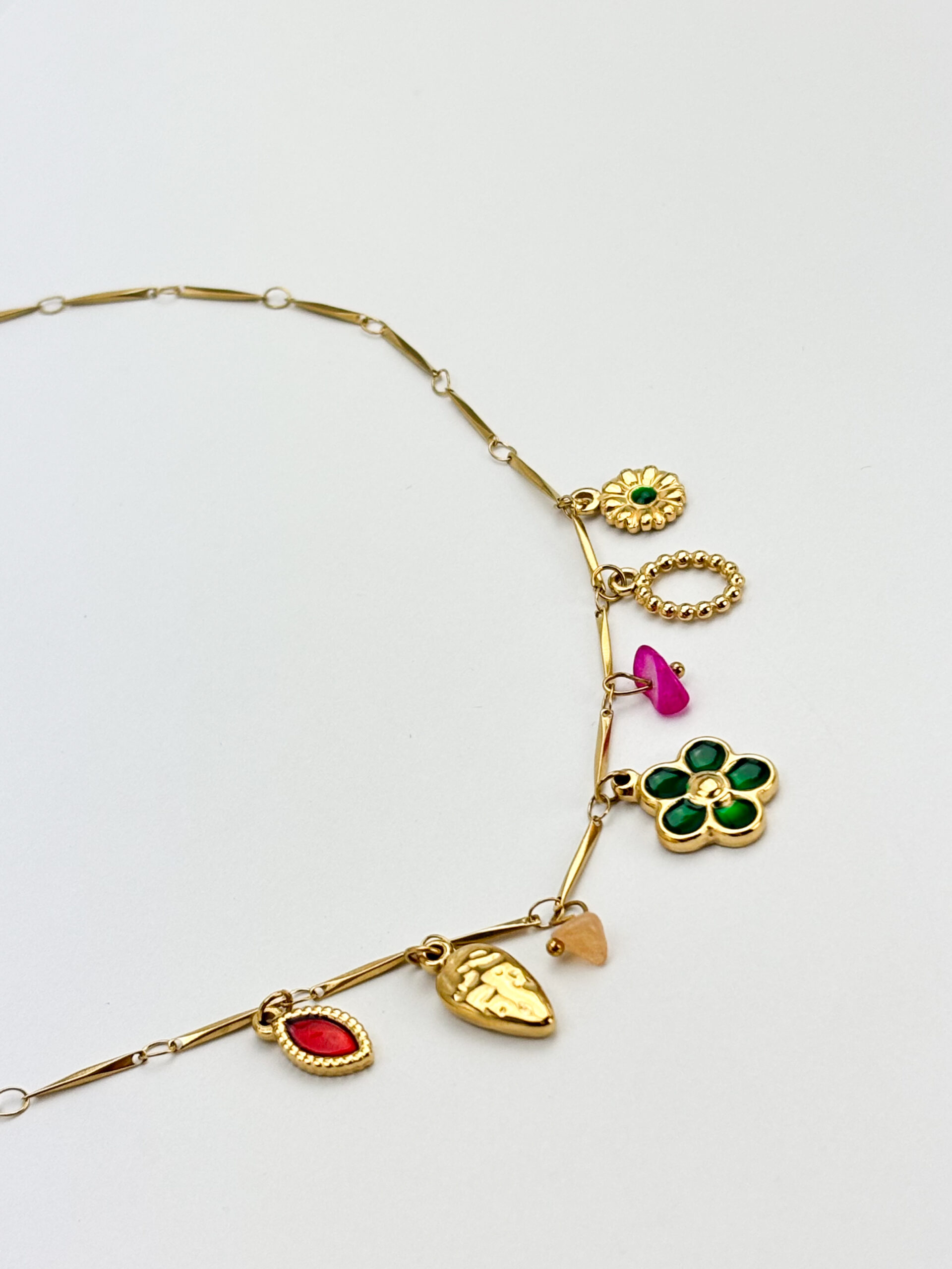 Deze vrolijke bedelketting van hoogwaardig stainless steel is een echte eyecatcher! De ketting is rijkelijk versierd met kleurige bedeltjes, zoals bloemetjes, steentjes en andere speelse details die perfect passen bij het voorjaar en de zomer.