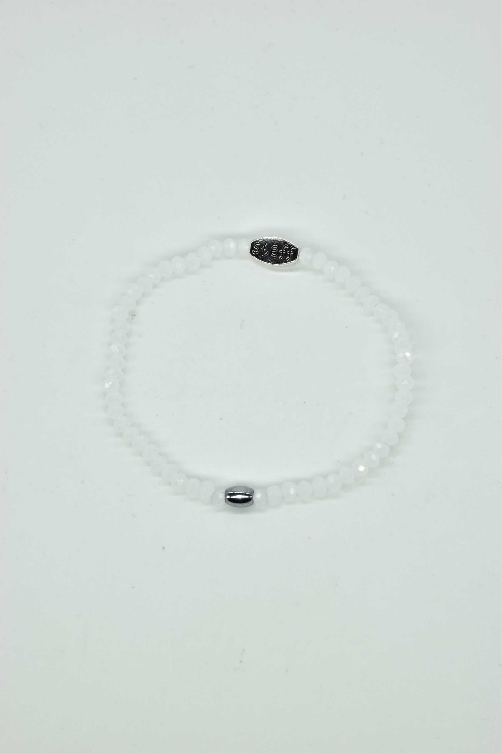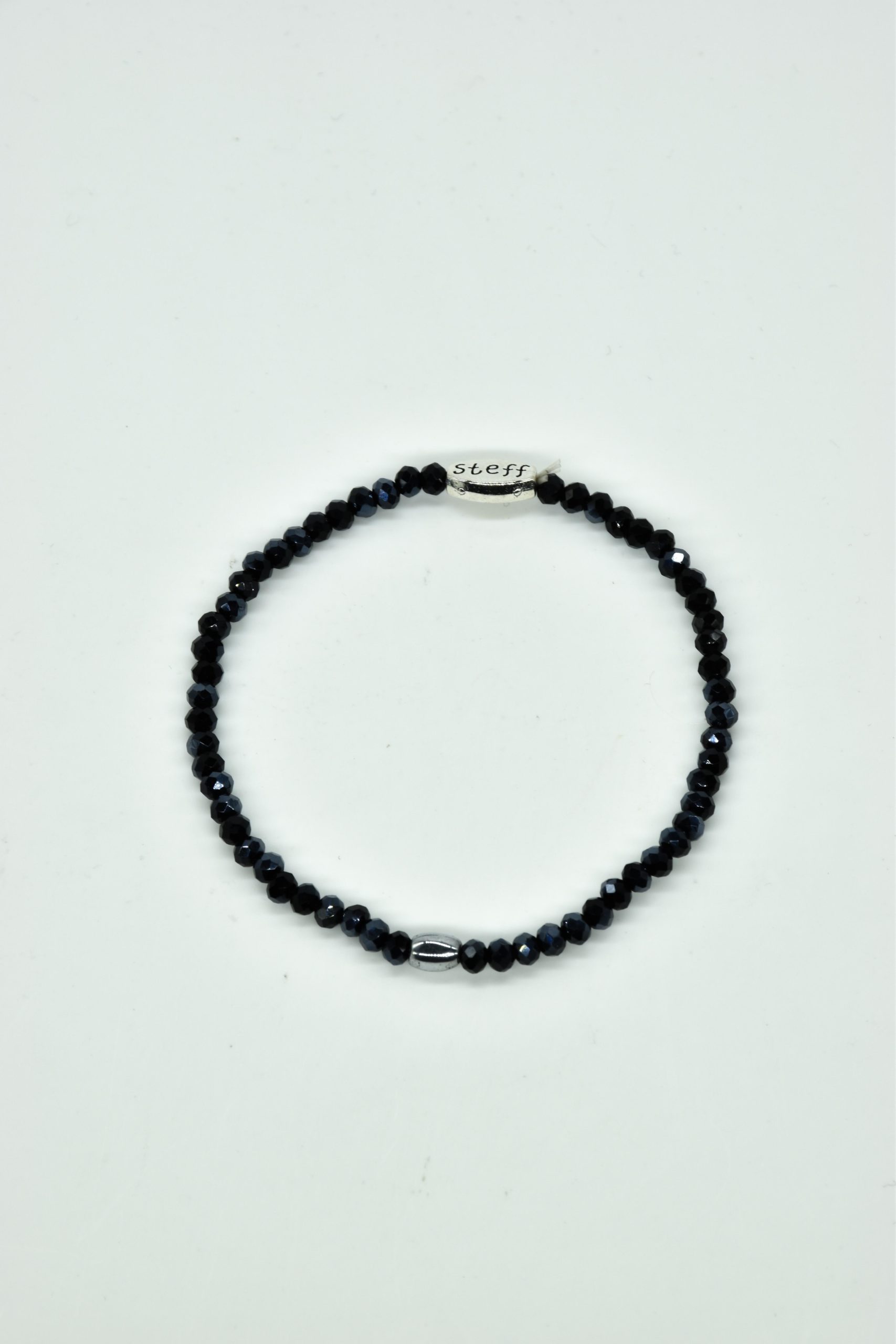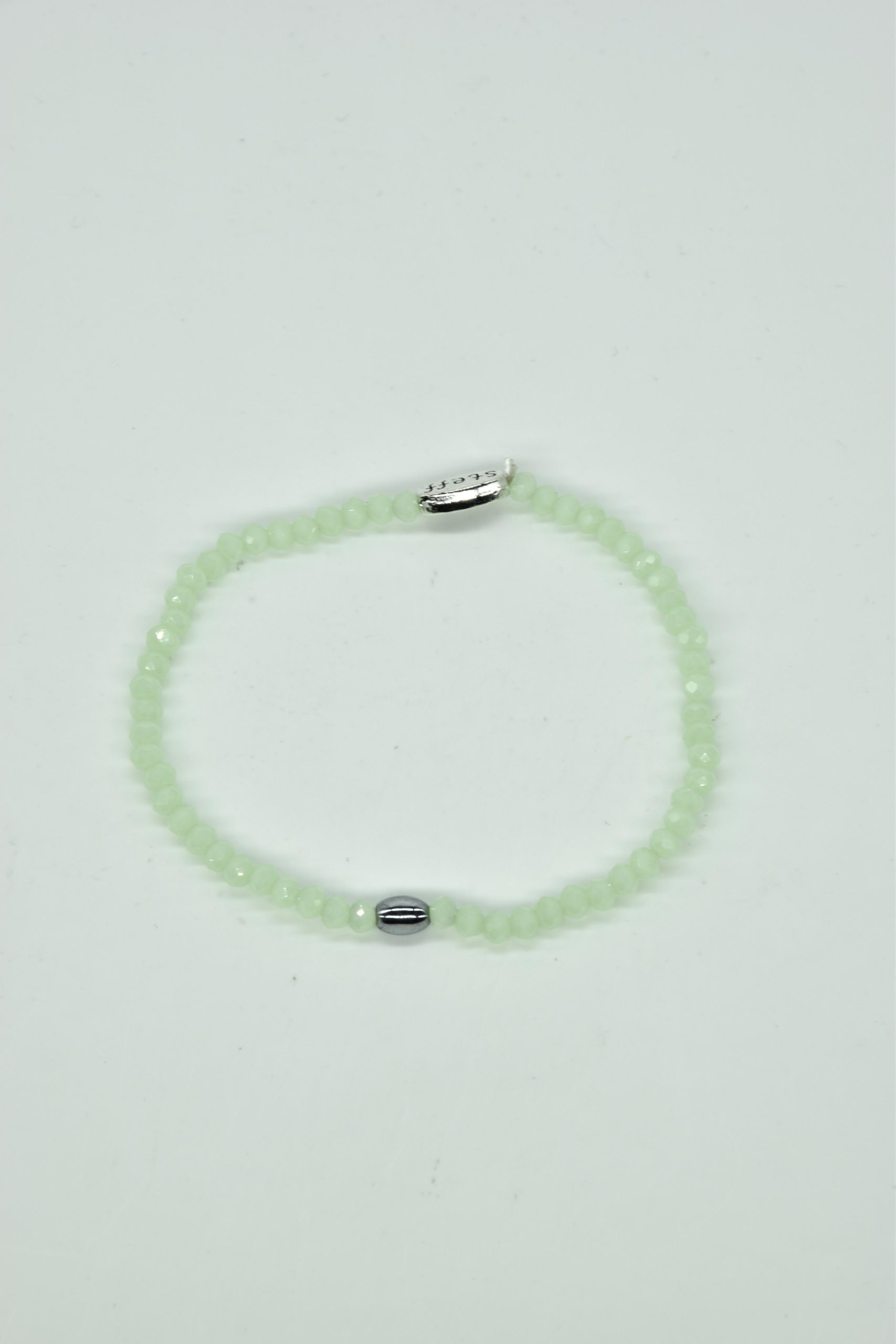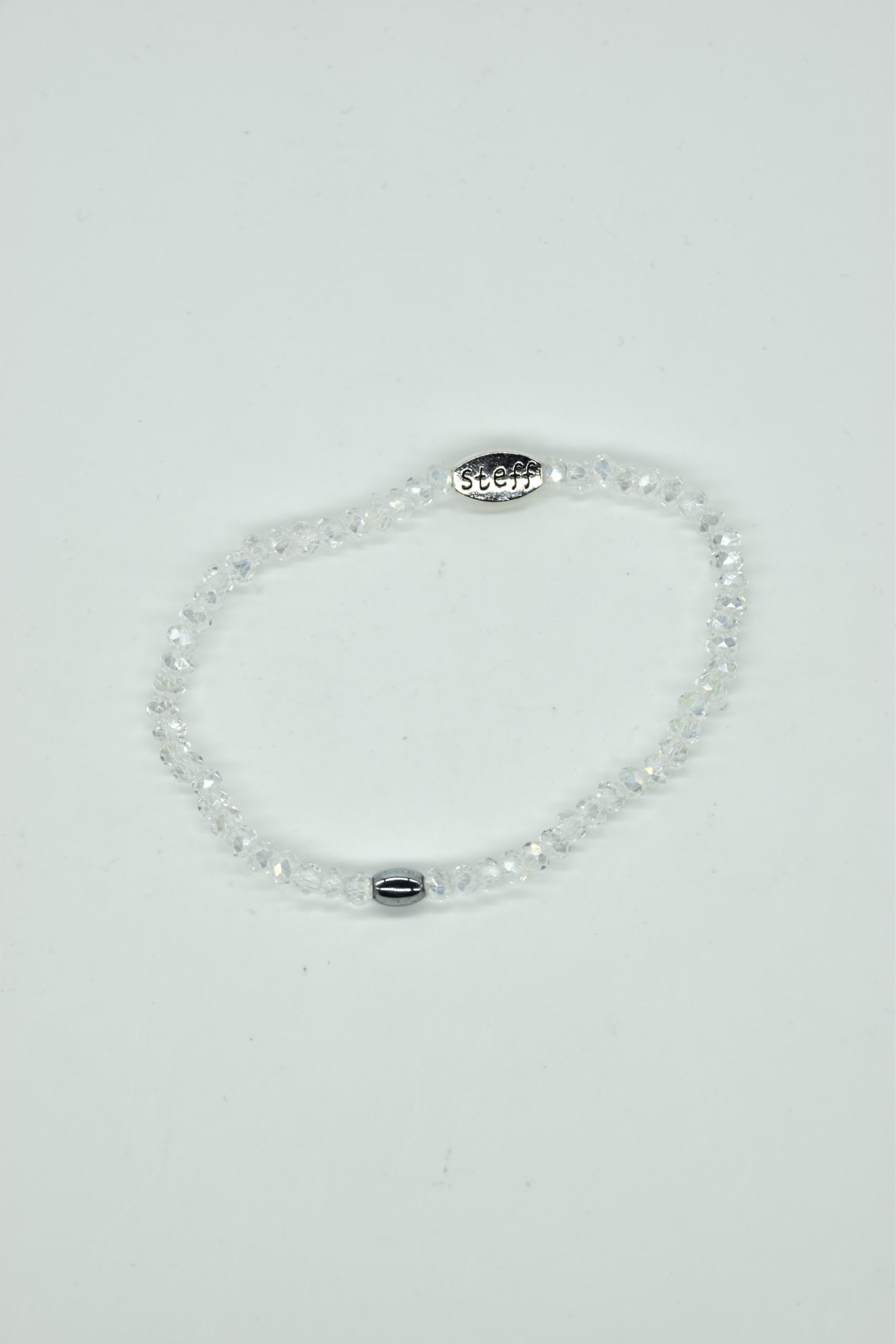 Claudia is prachtig in haar eenvoud. Dit is een armbandje van hele fijne facet geslepen kristallen kraaltjes met een ovaal metalen kraaltje in het midden. De armband is 18,5 cm in omtrek en met liefde uitgezocht door Steff. Natuurlijk is ook dit armbandje nikkelvrij.