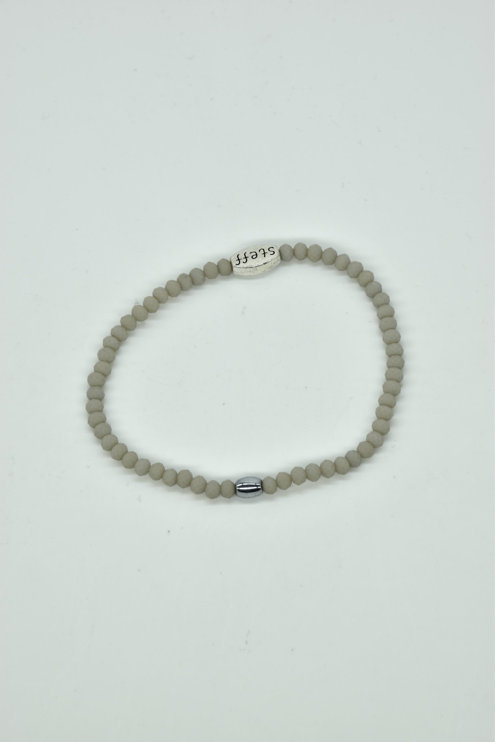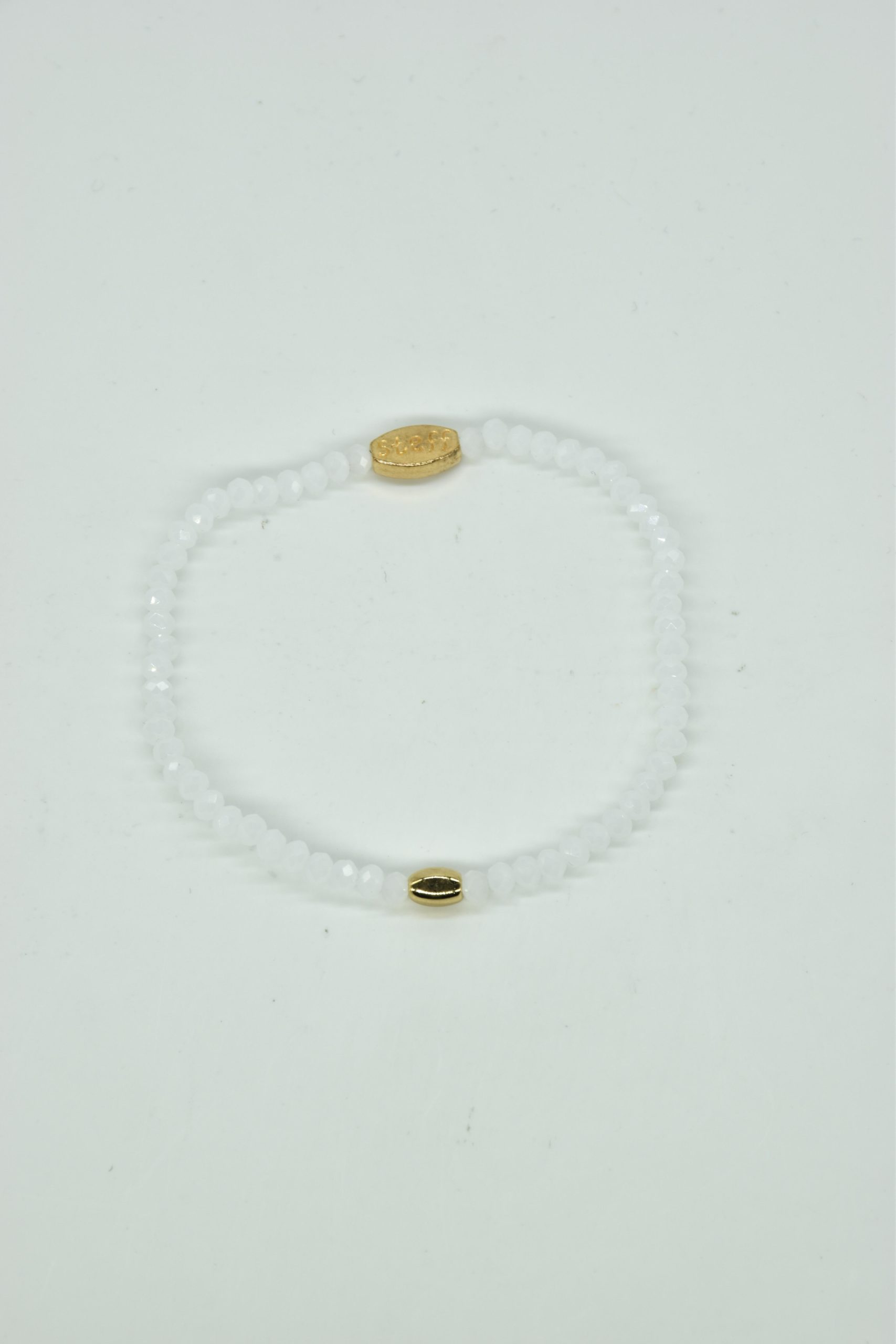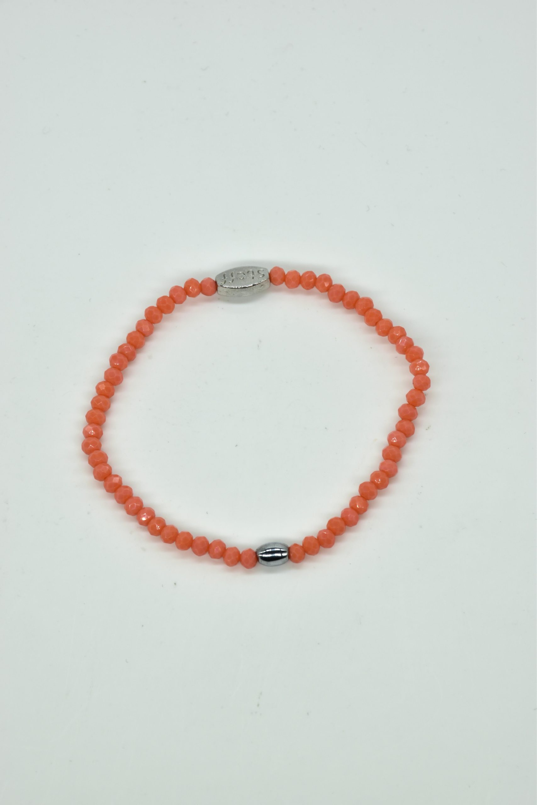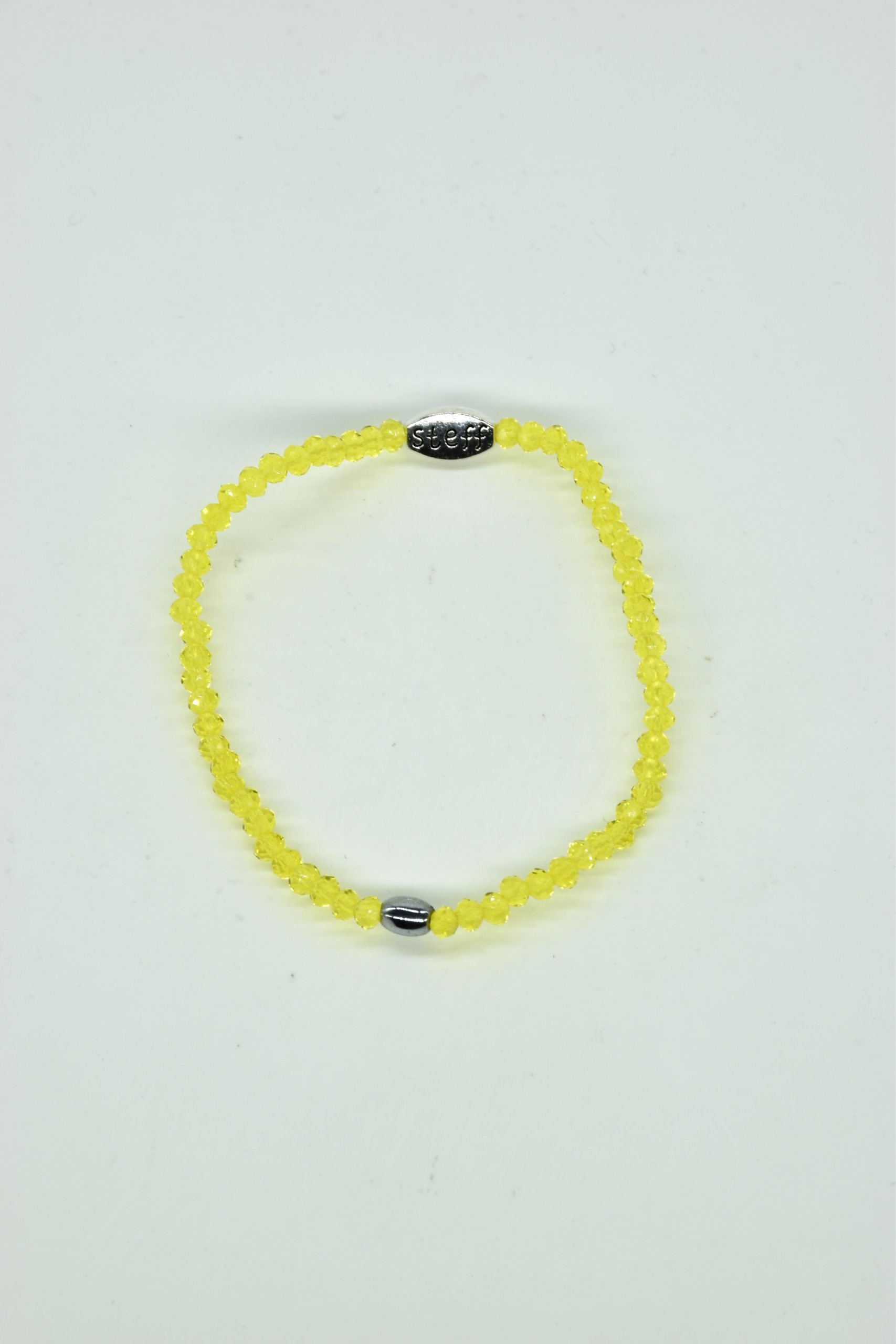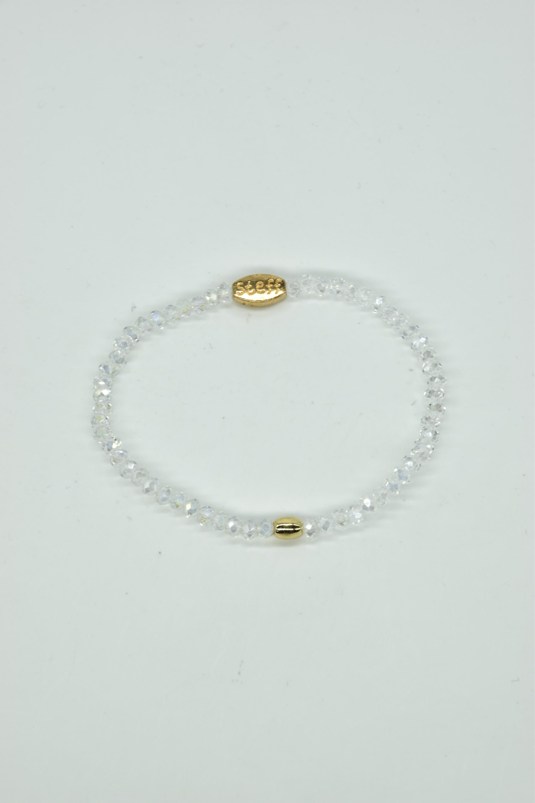 Claudia is prachtig in haar eenvoud. Dit is een armbandje van hele fijne facet geslepen kristallen kraaltjes met een ovaal metalen kraaltje in het midden. De armband is 18,5 cm in omtrek en met liefde uitgezocht door Steff. Natuurlijk is ook dit armbandje nikkelvrij.