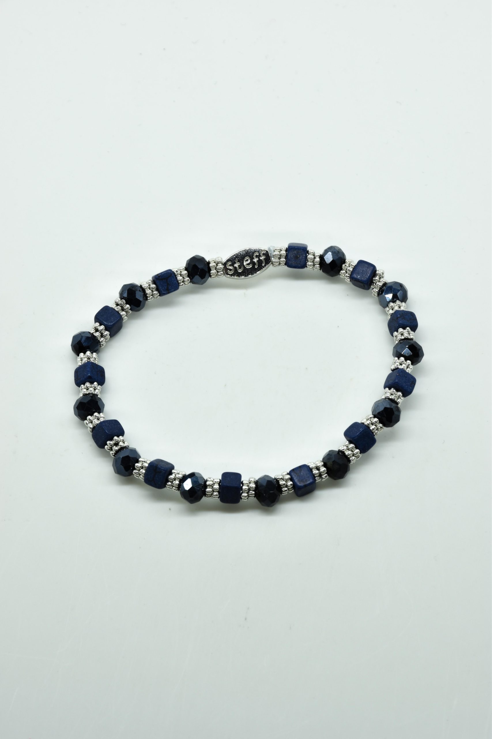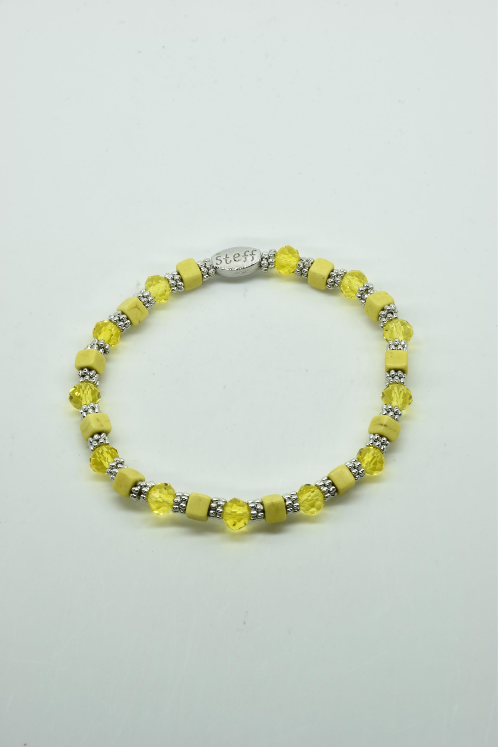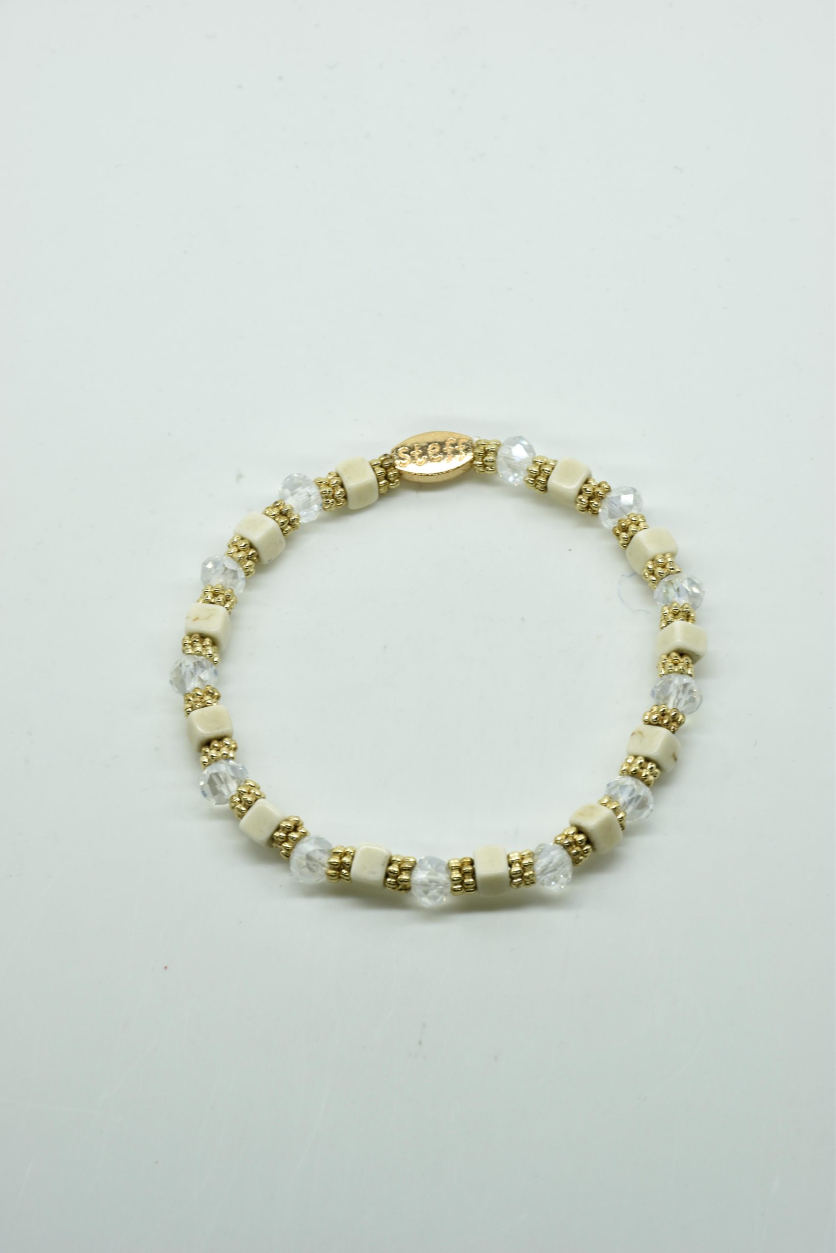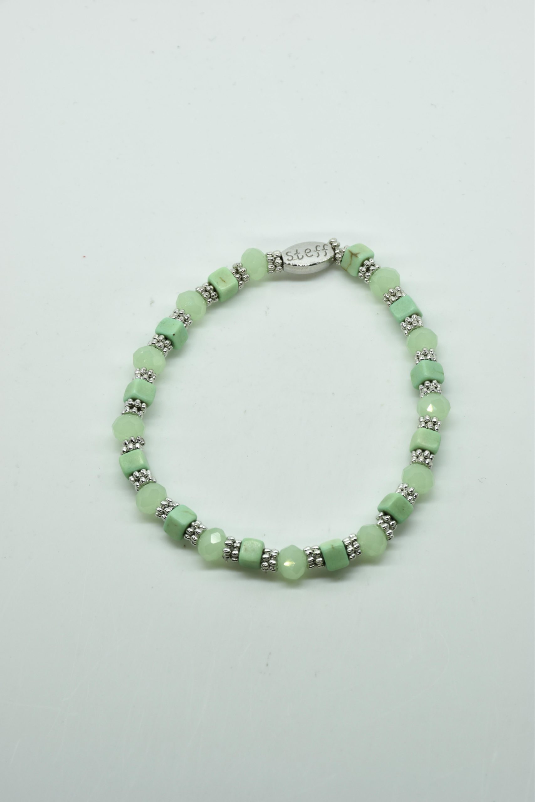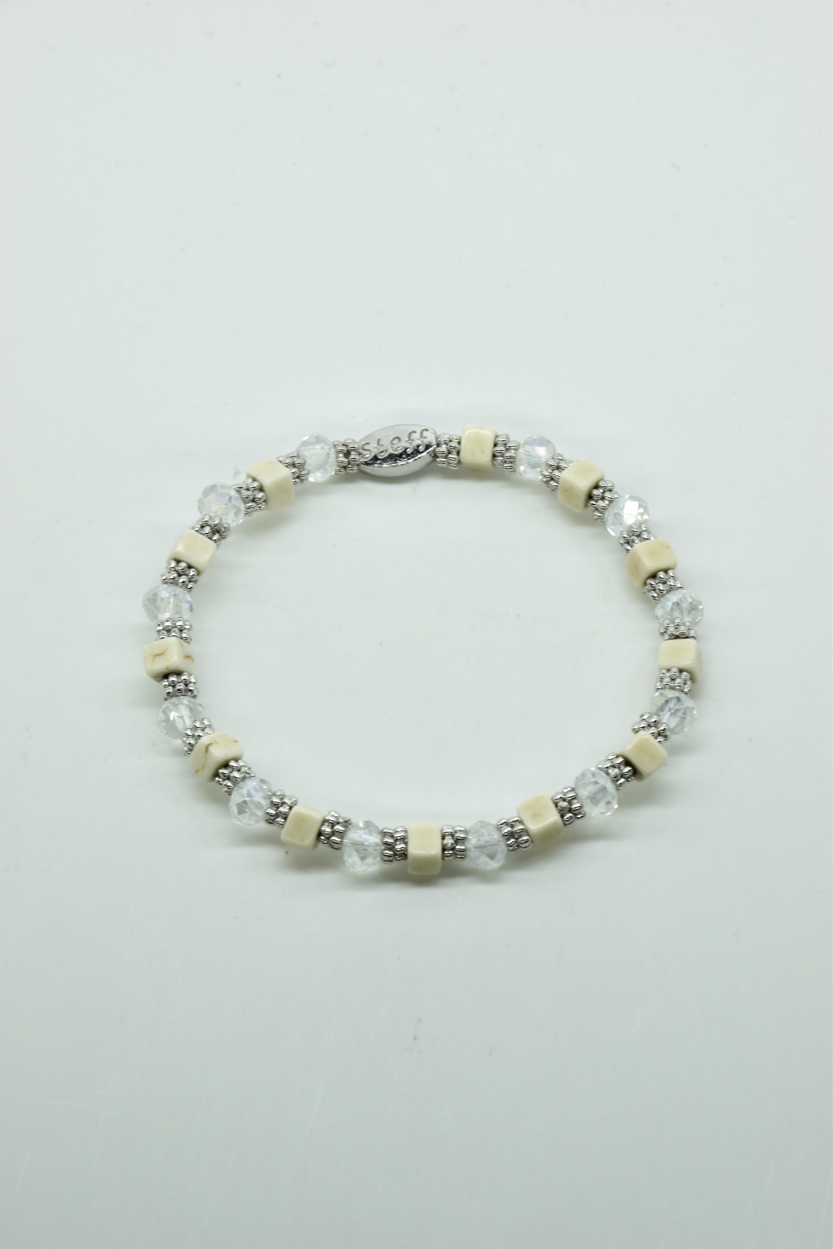 Armbandje Gwen is een leuke speelse combinatie van facet geslepen kristallen kraaltjes in combinatie met nikkelvrij metalen rondel kraaltjes en vierkante composiet kraaltjes. De armbandjes zijn 18,5 cm. Deze armbandjes zijn heel goed te combinereen met de zeer uitgebreide collectie van Steff.