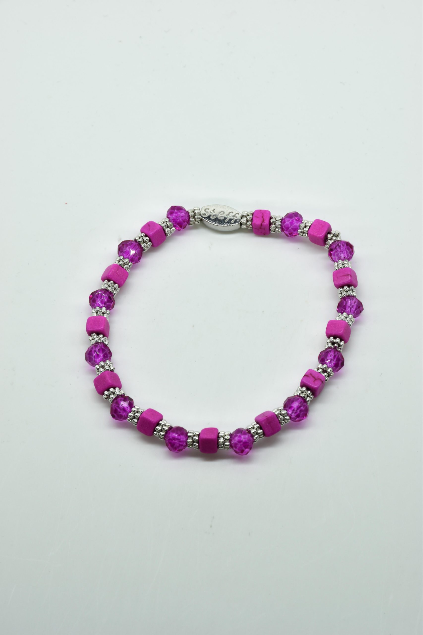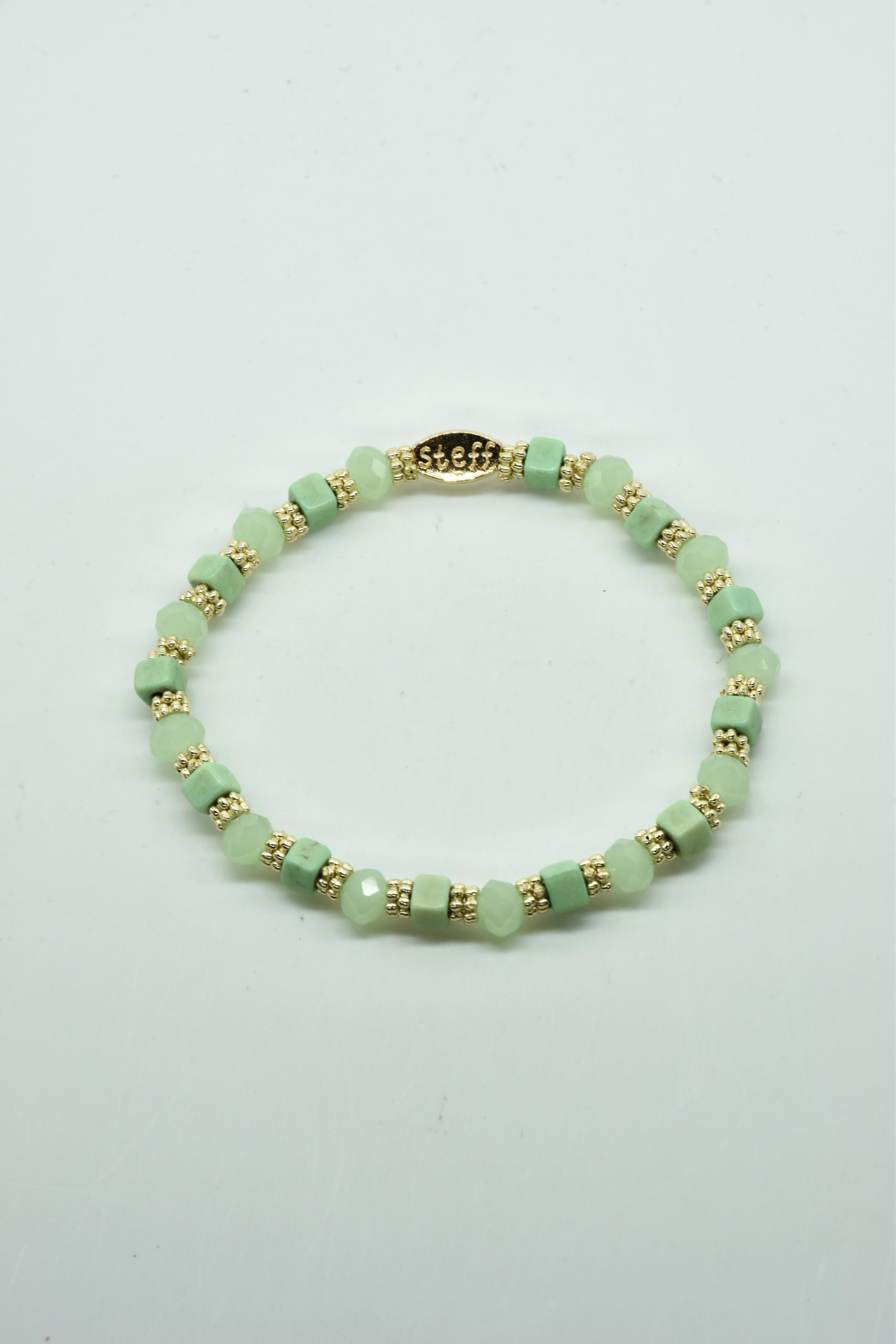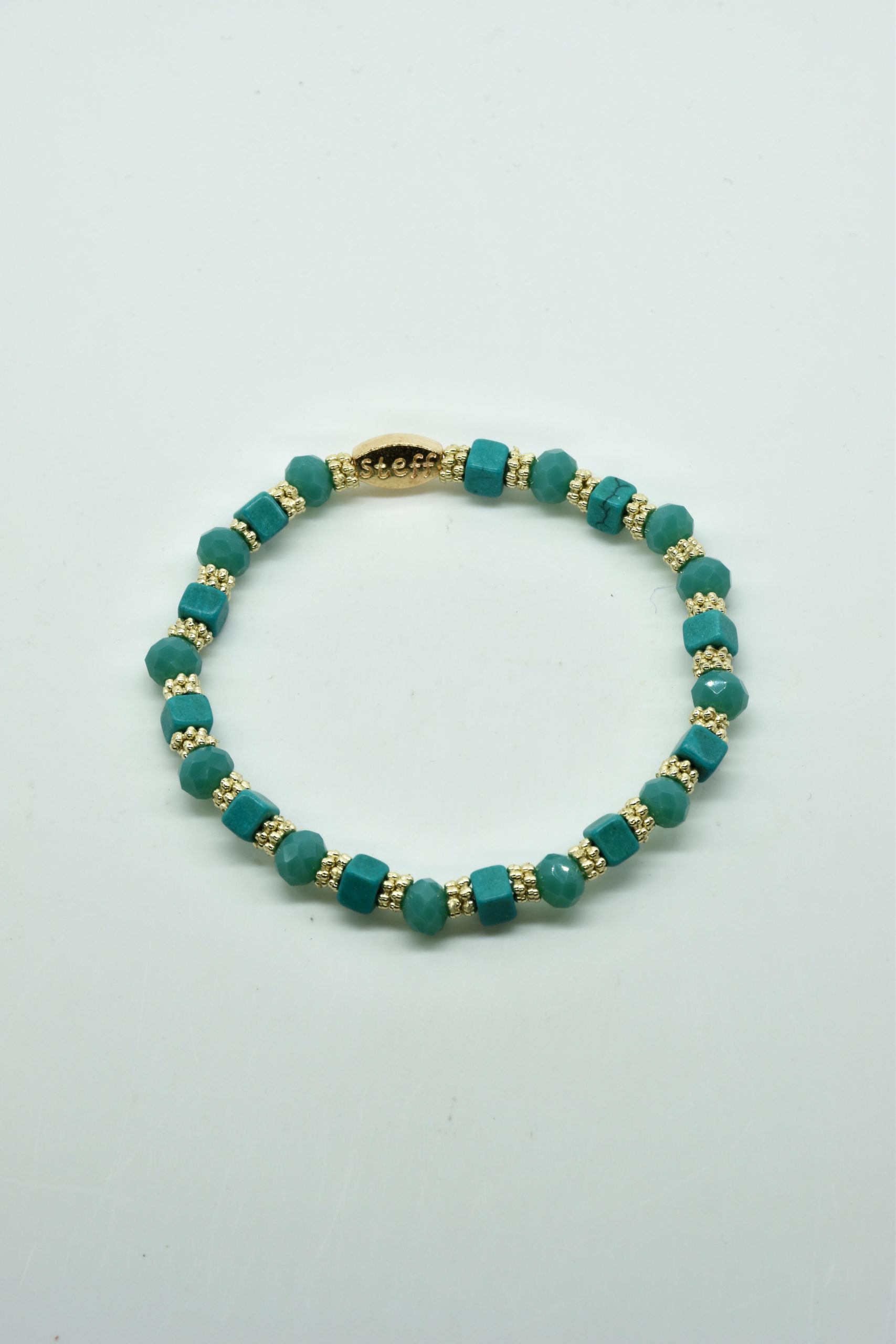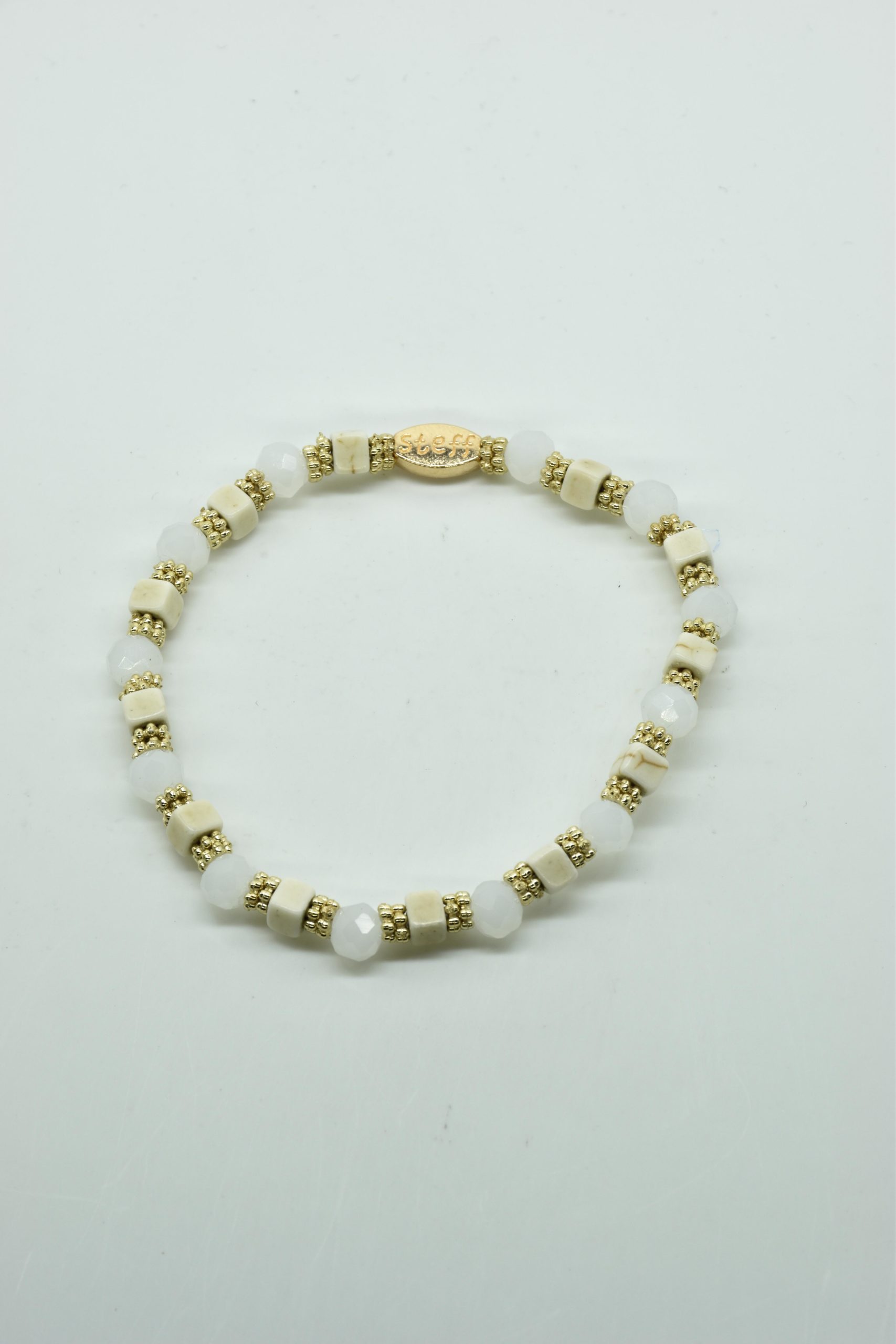 Armbandje Gwen is een leuke speelse combinatie van facet geslepen kristallen kraaltjes in combinatie met nikkelvrij metalen rondel kraaltjes en vierkante composiet kraaltjes. De armbandjes zijn 18,5 cm. Deze armbandjes zijn heel goed te combinereen met de zeer uitgebreide collectie van Steff.