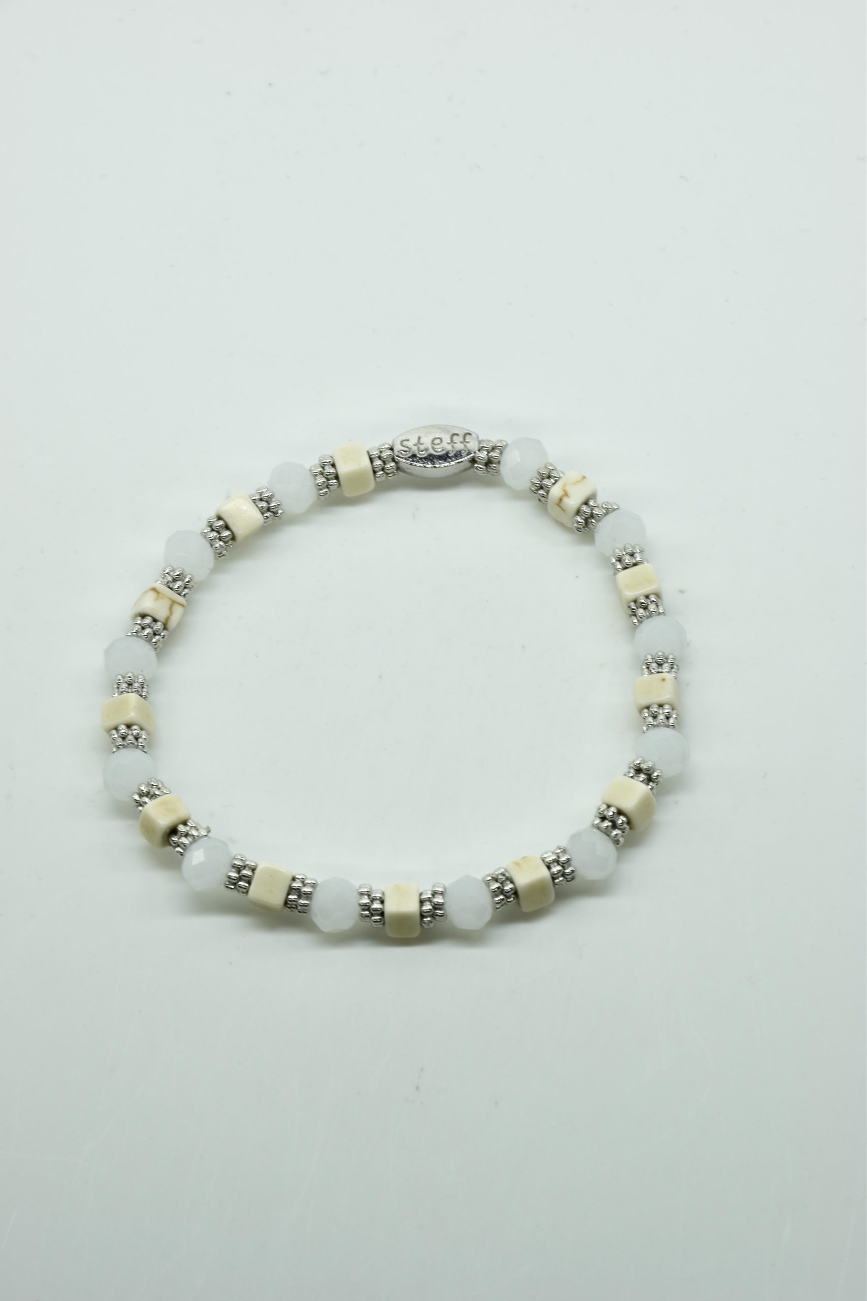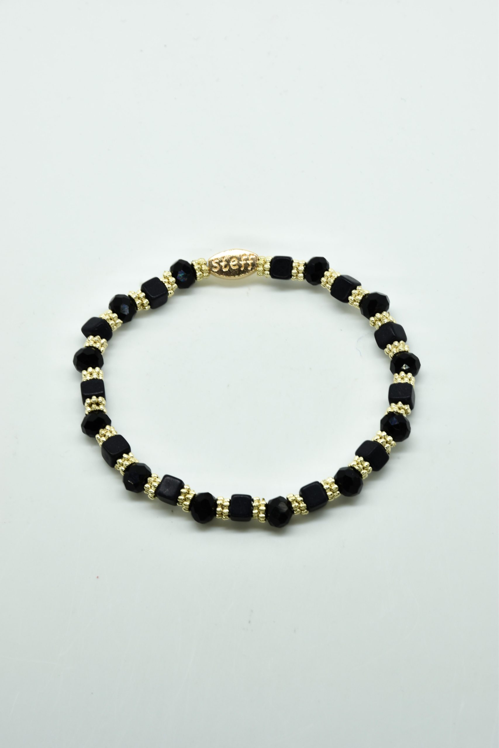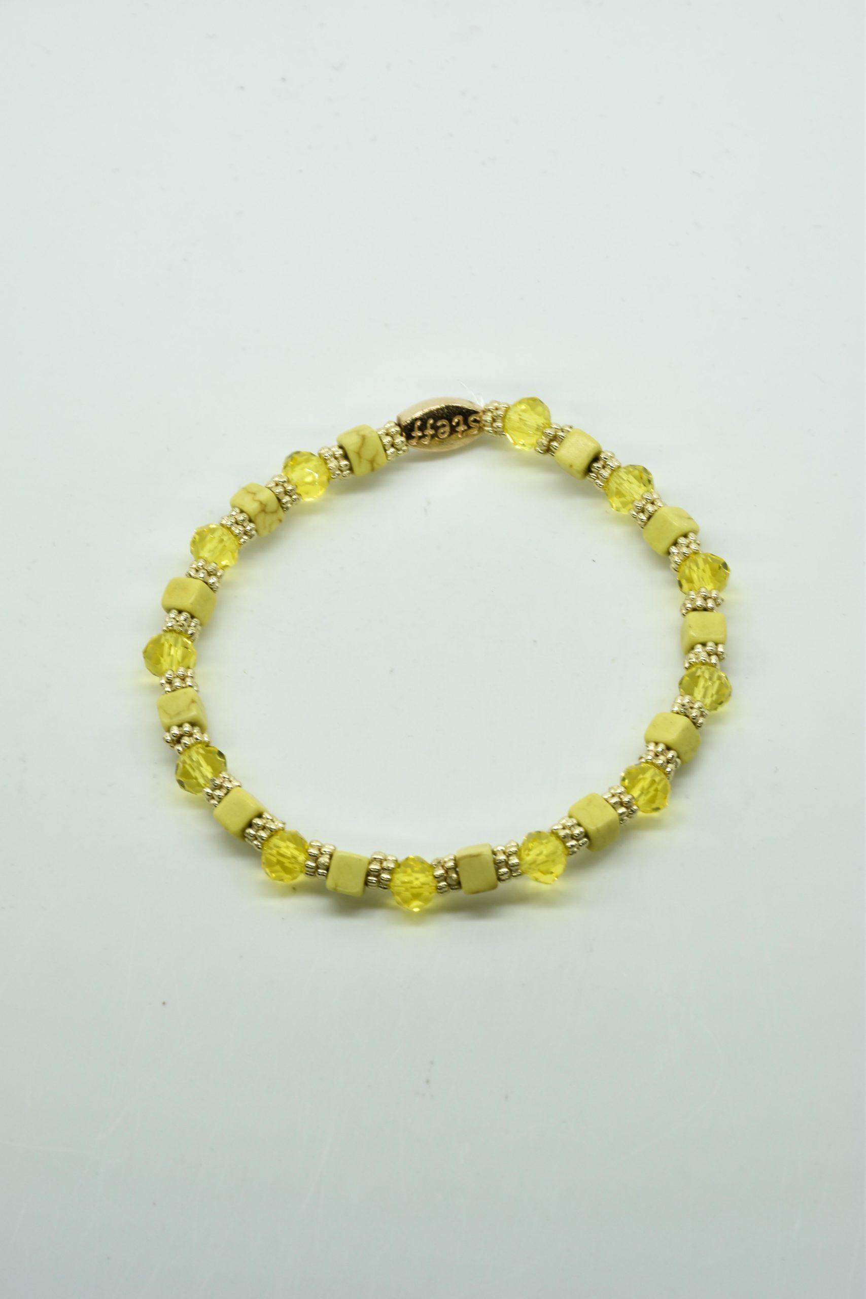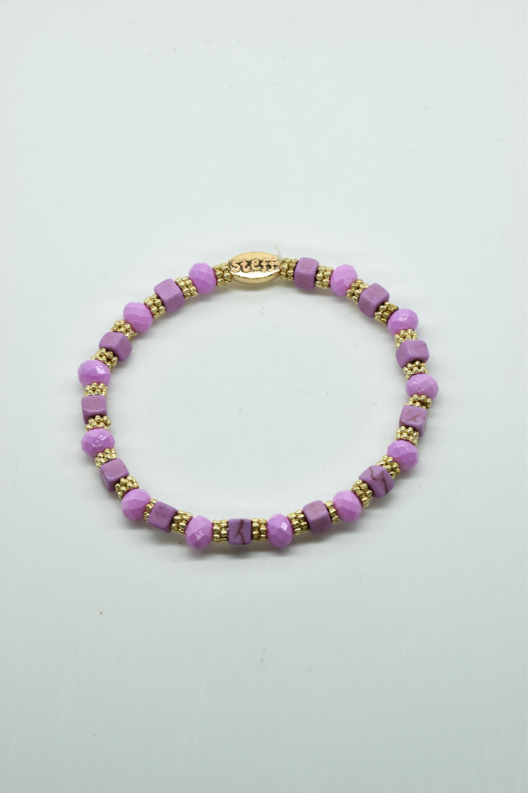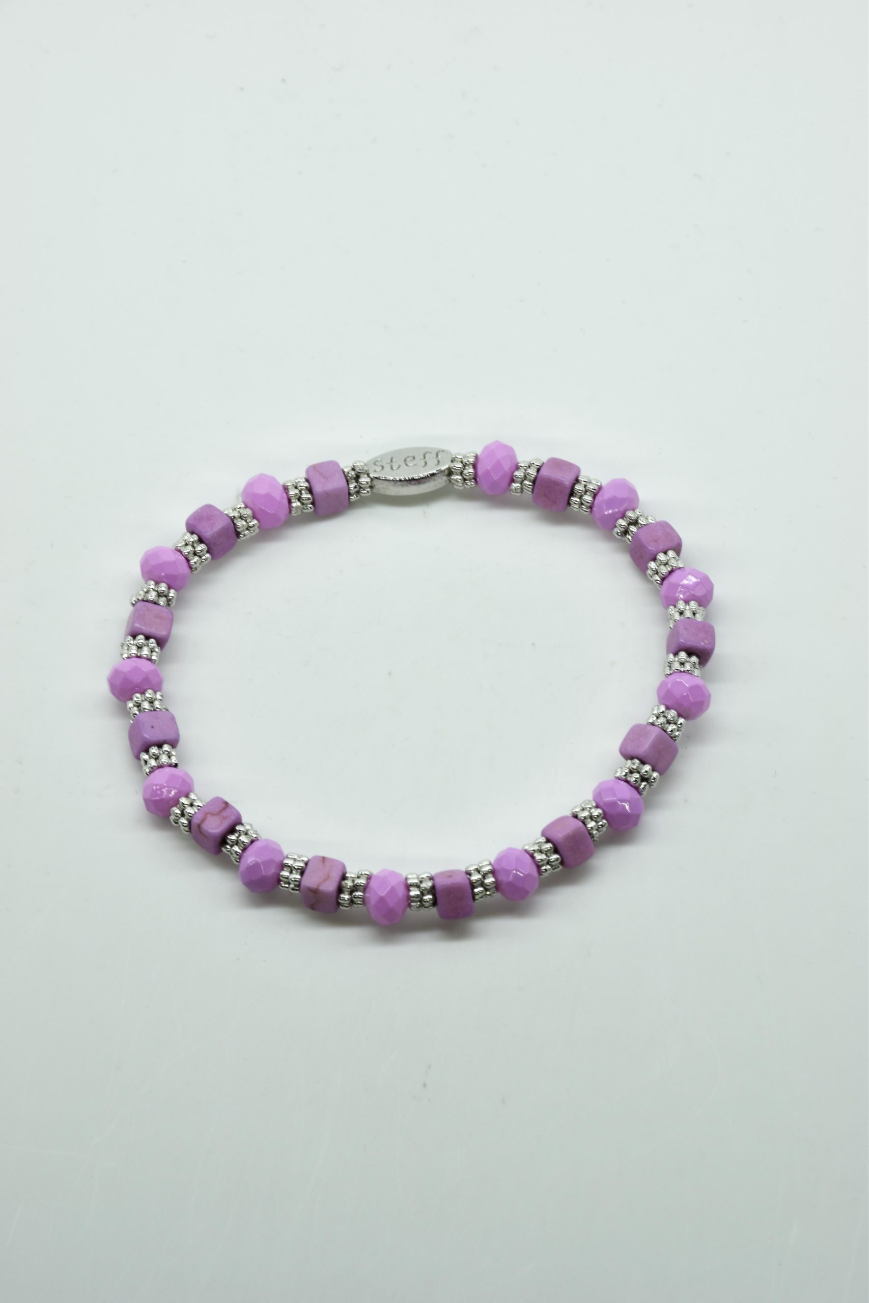Armbandje Gwen is een leuke speelse combinatie van facet geslepen kristallen kraaltjes in combinatie met nikkelvrij metalen rondel kraaltjes en vierkante composiet kraaltjes. De armbandjes zijn 18,5 cm. Deze armbandjes zijn heel goed te combinereen met de zeer uitgebreide collectie van Steff.