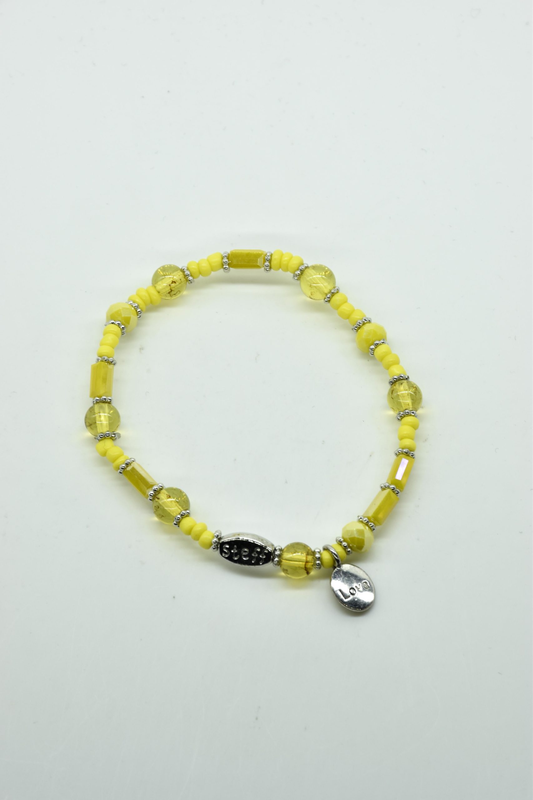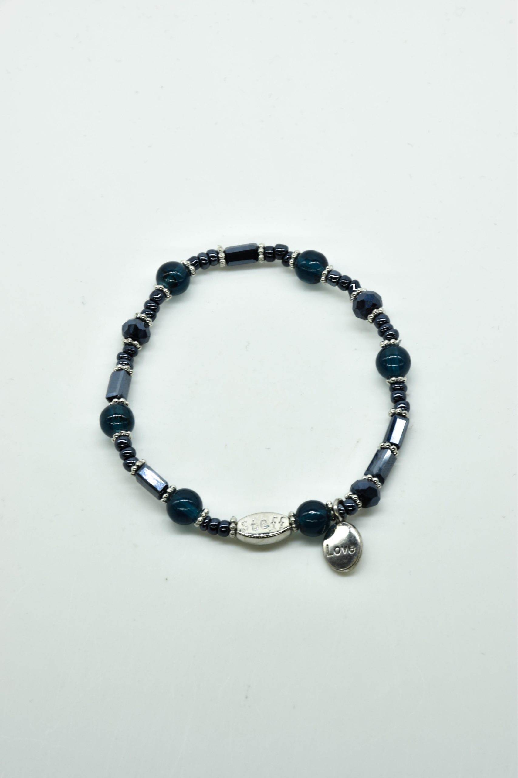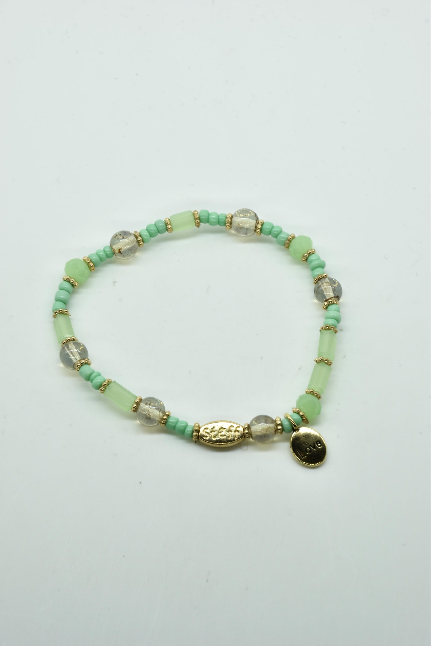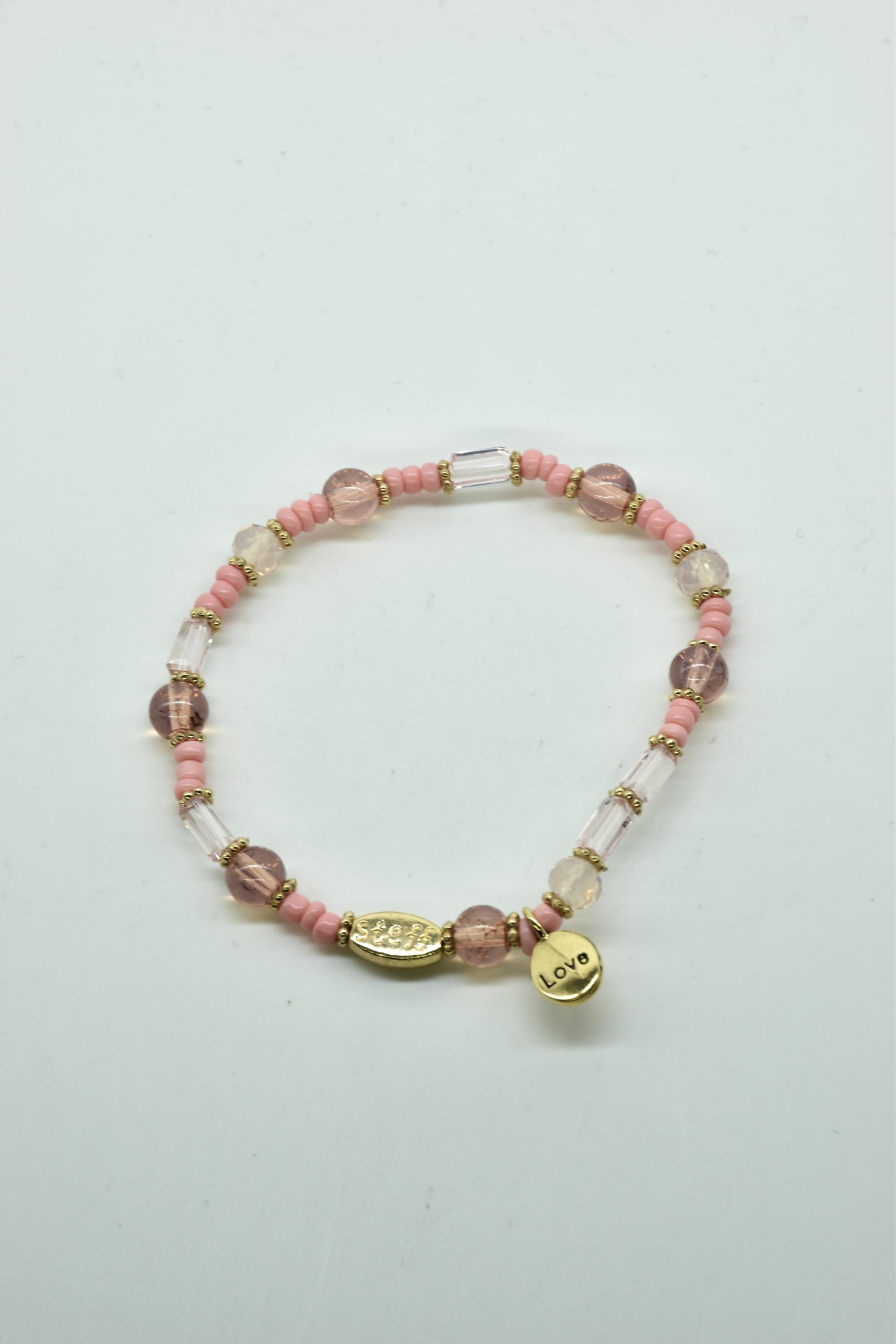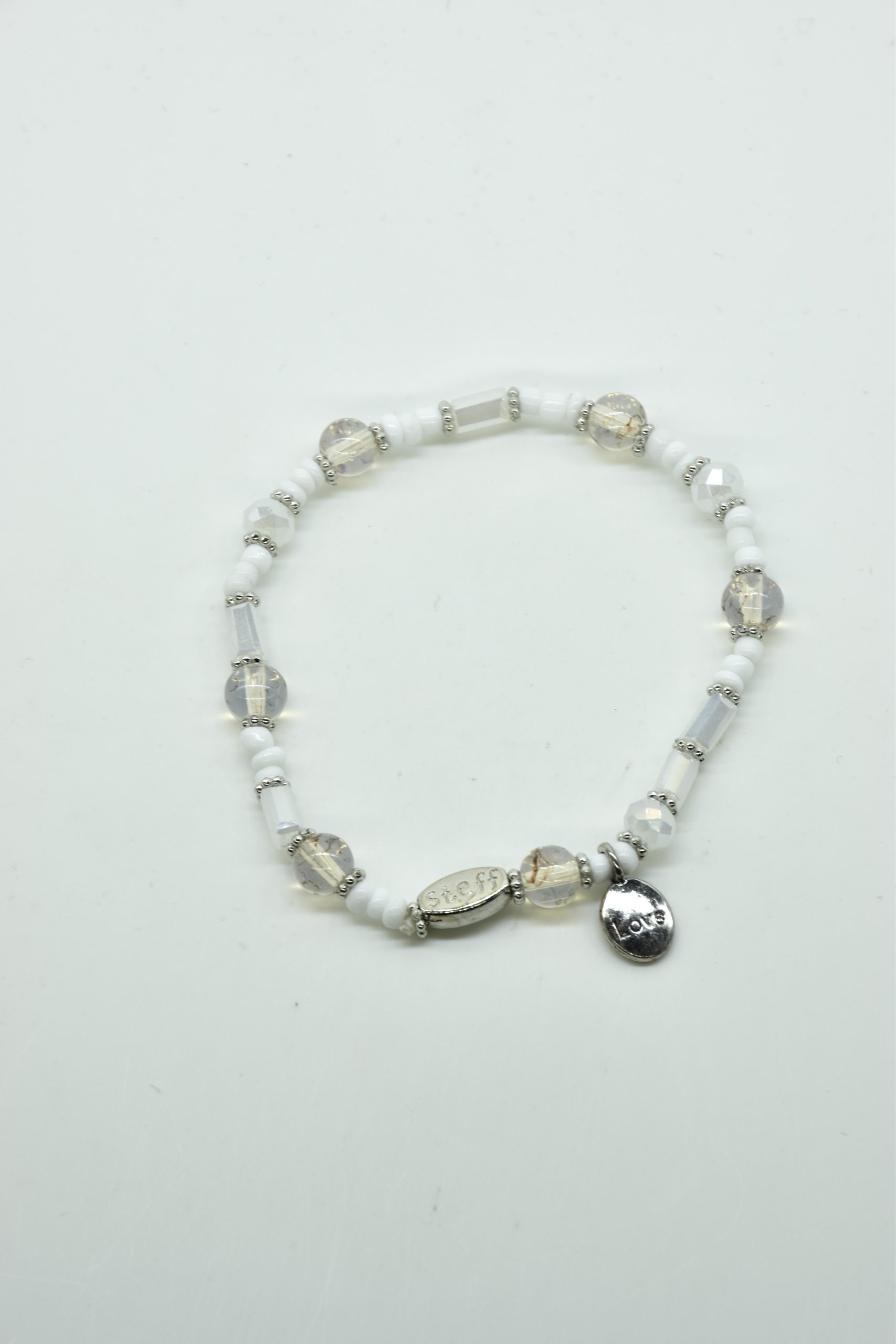 Armbandje met facet geslepen kristallen kraaltjes en rechthoekige metalen kraaltjes. 18,5 cm omtrek en geregen op sterk elastiek. Alle sieraden van Steff zijn nikkelvrij en met zorg ontworpen en samengesteld. Hel goed te combineren met andere armbandjes uit de collectie van Steff.
