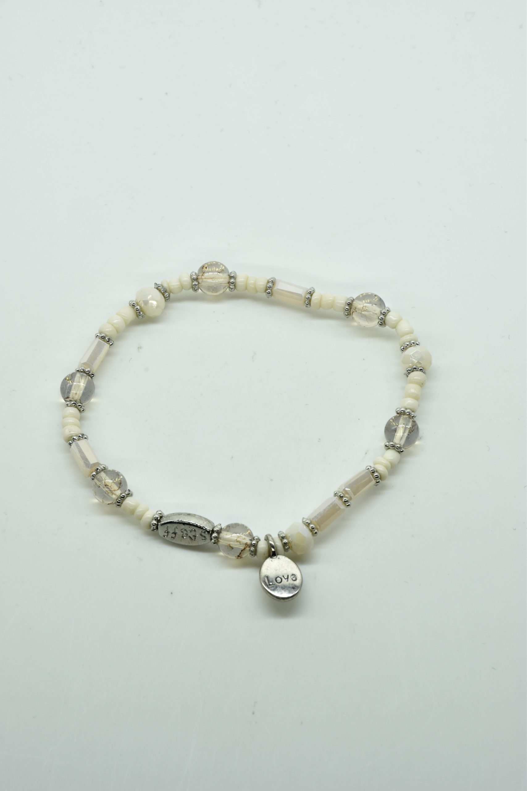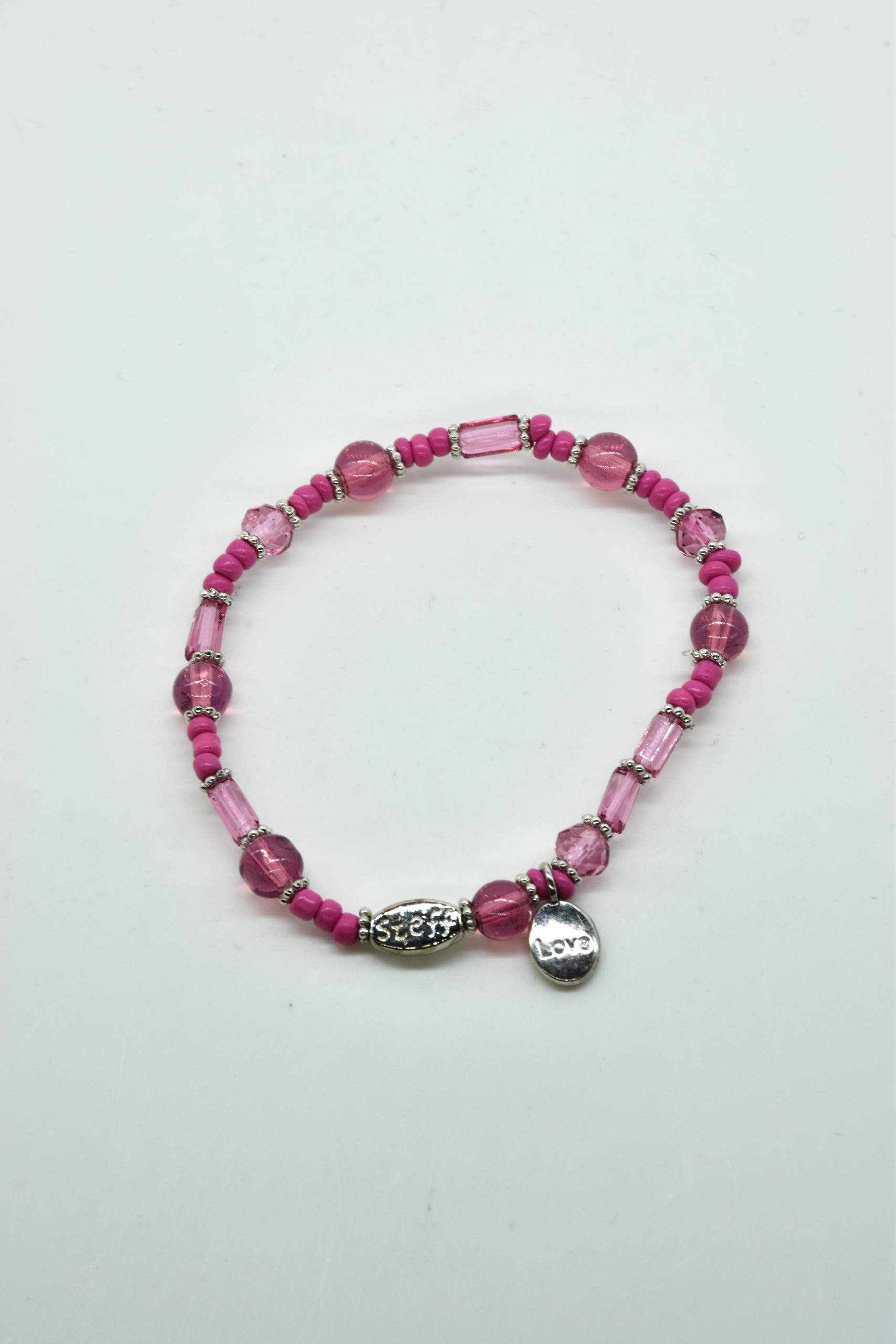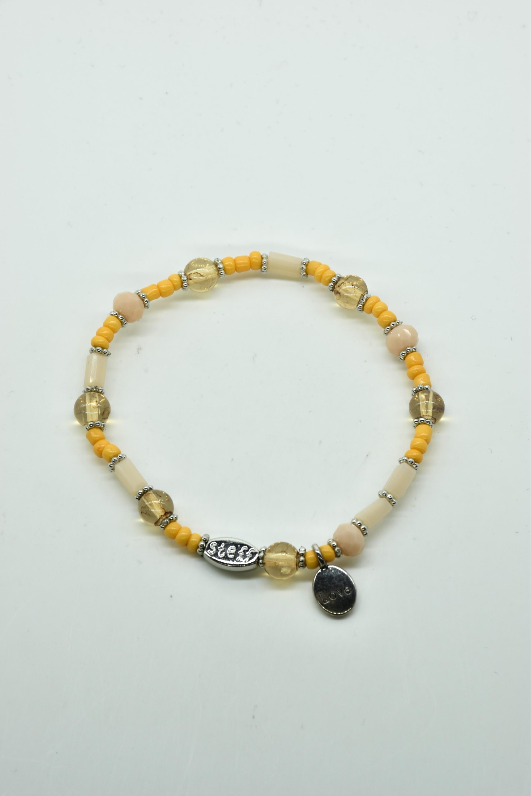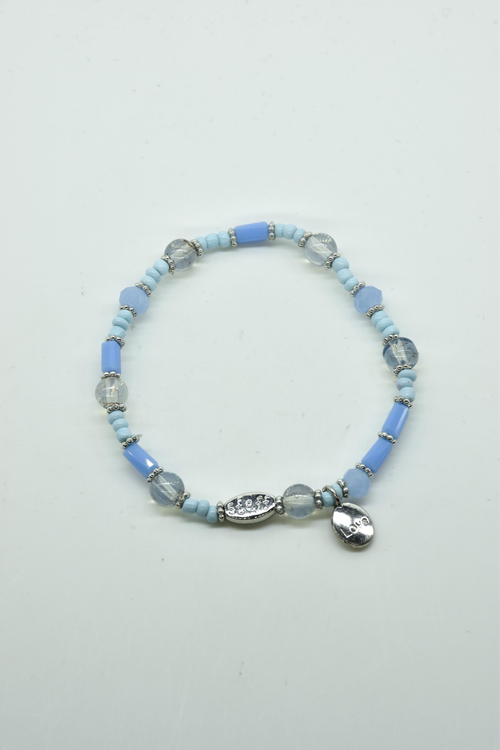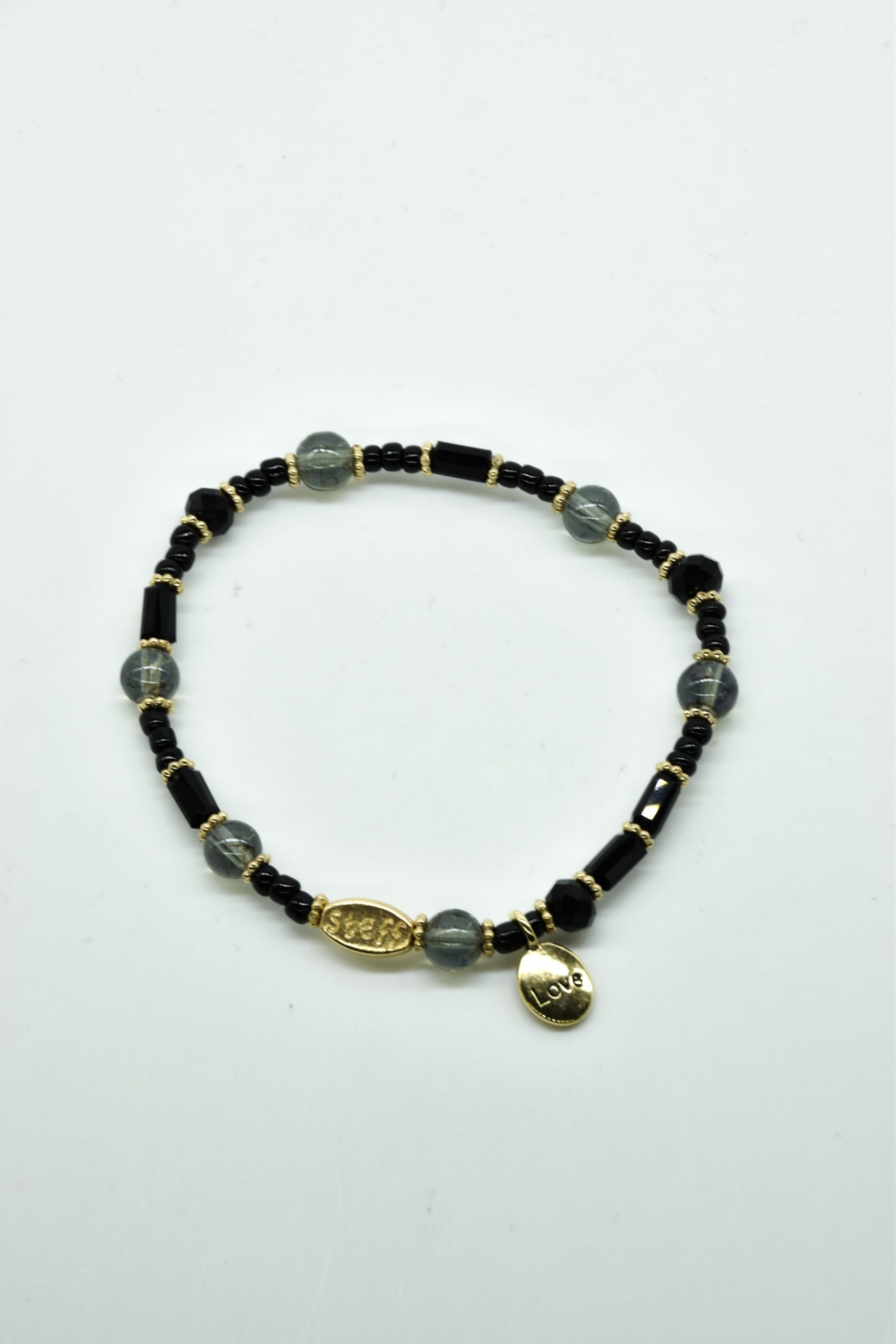 Armbandje met facet geslepen kristallen kraaltjes en rechthoekige metalen kraaltjes. 18,5 cm omtrek en geregen op sterk elastiek. Alle sieraden van Steff zijn nikkelvrij en met zorg ontworpen en samengesteld. Hel goed te combineren met andere armbandjes uit de collectie van Steff.