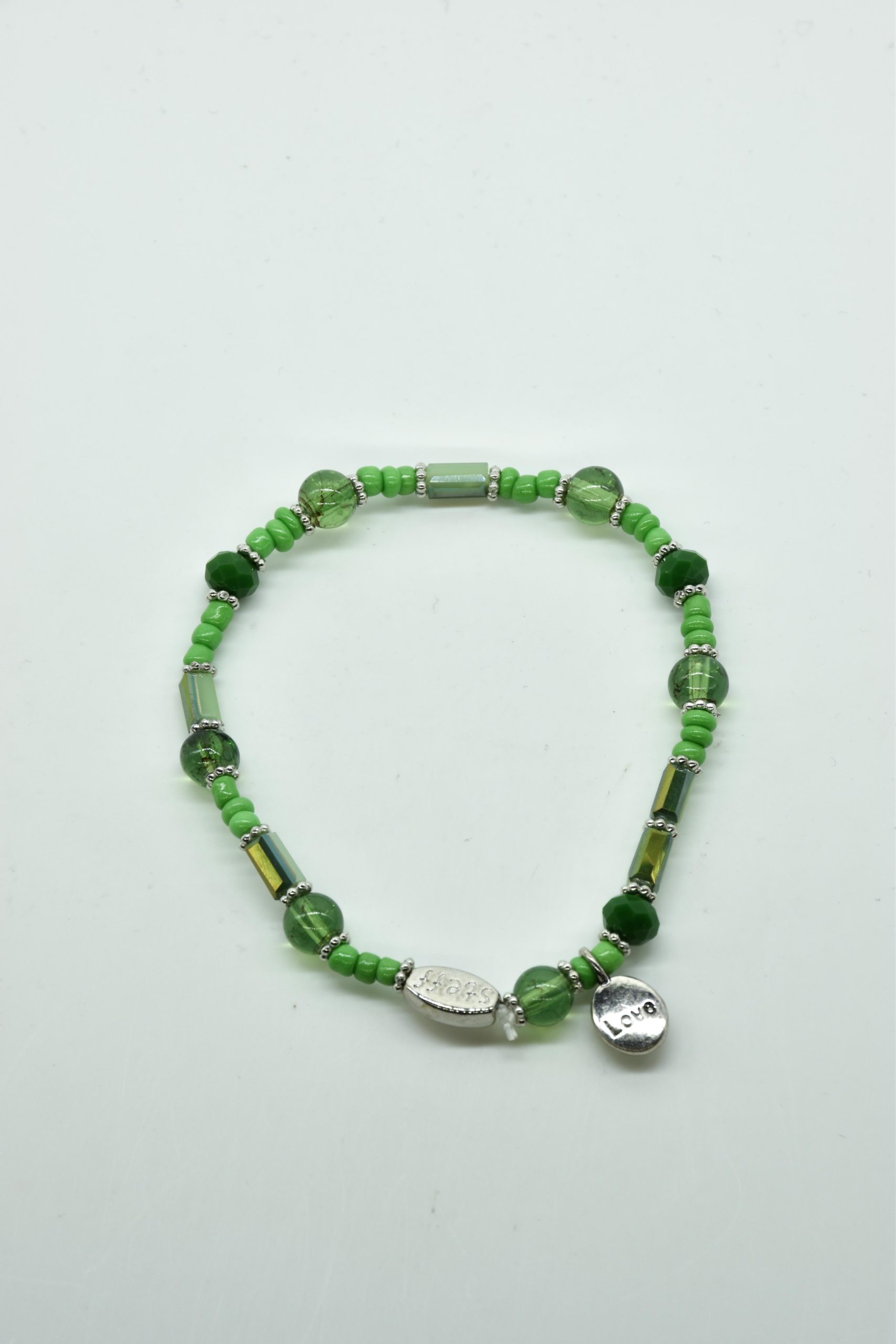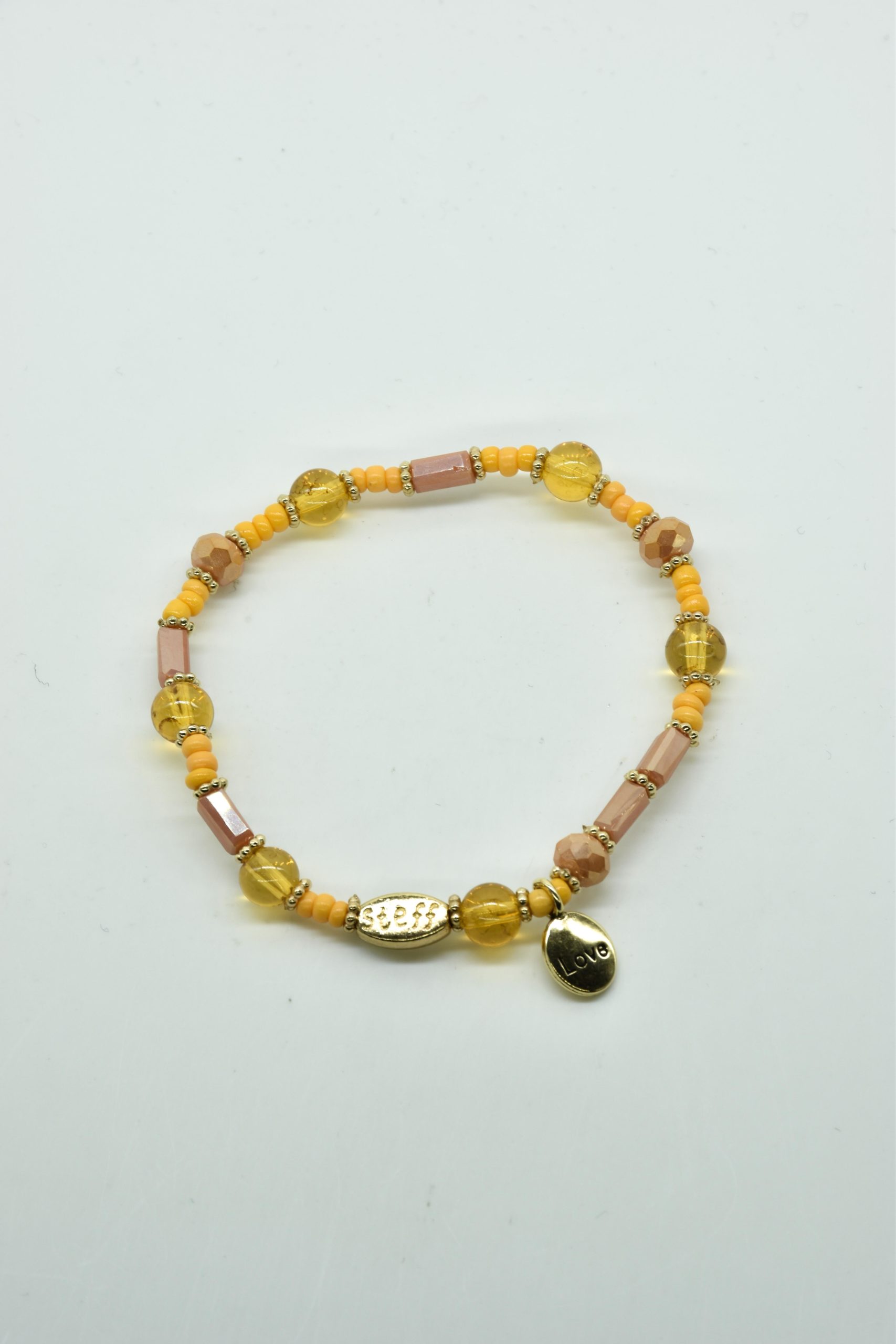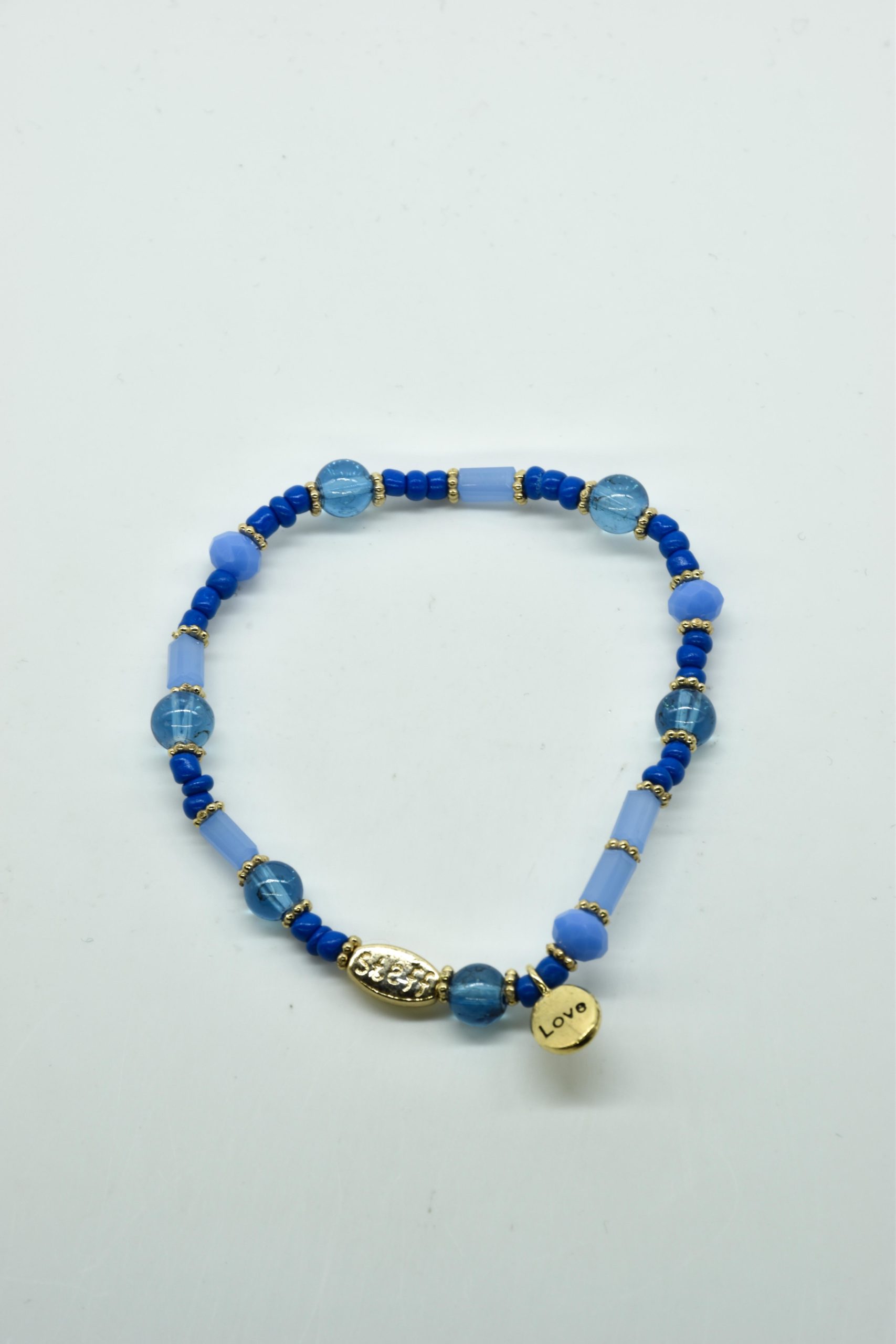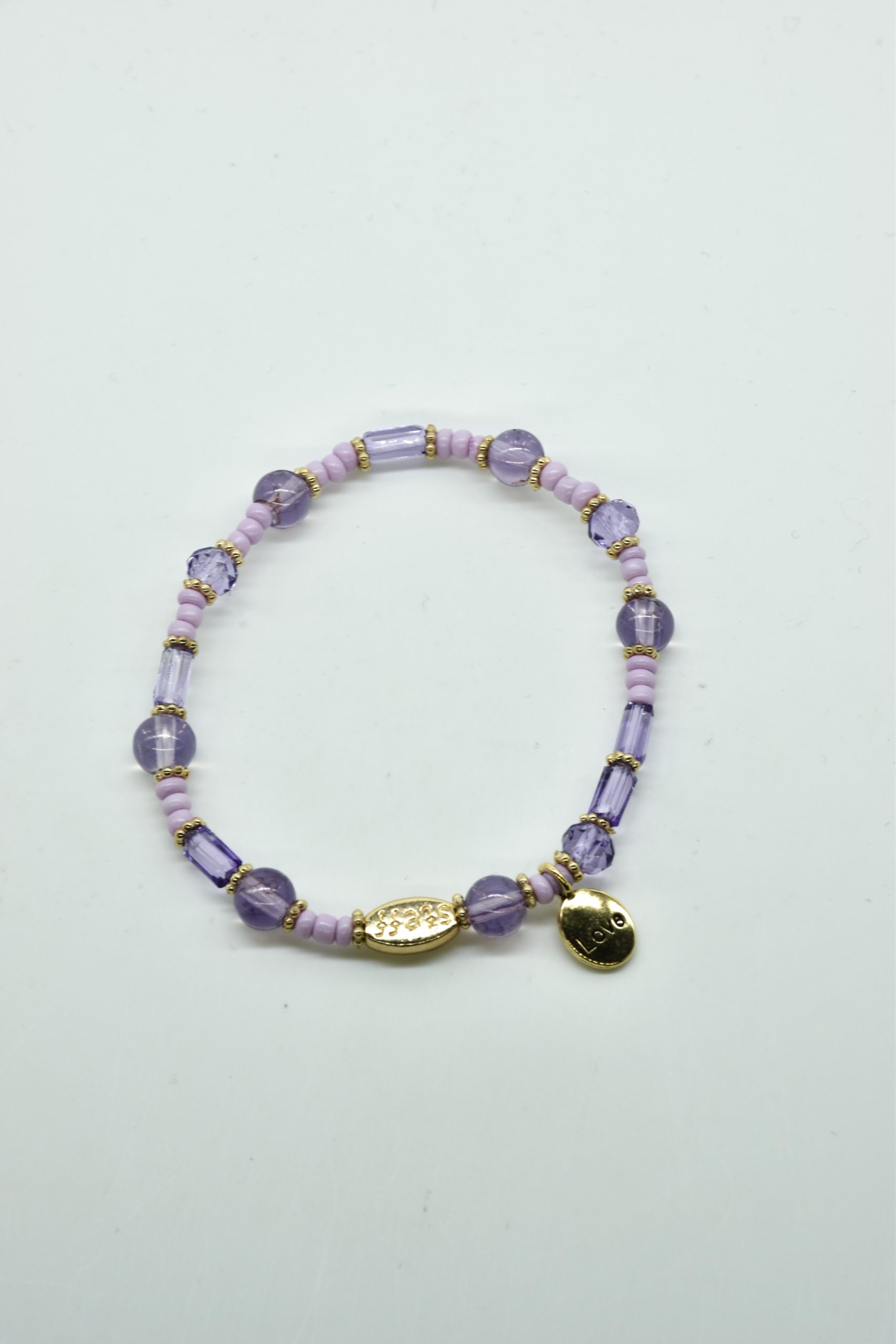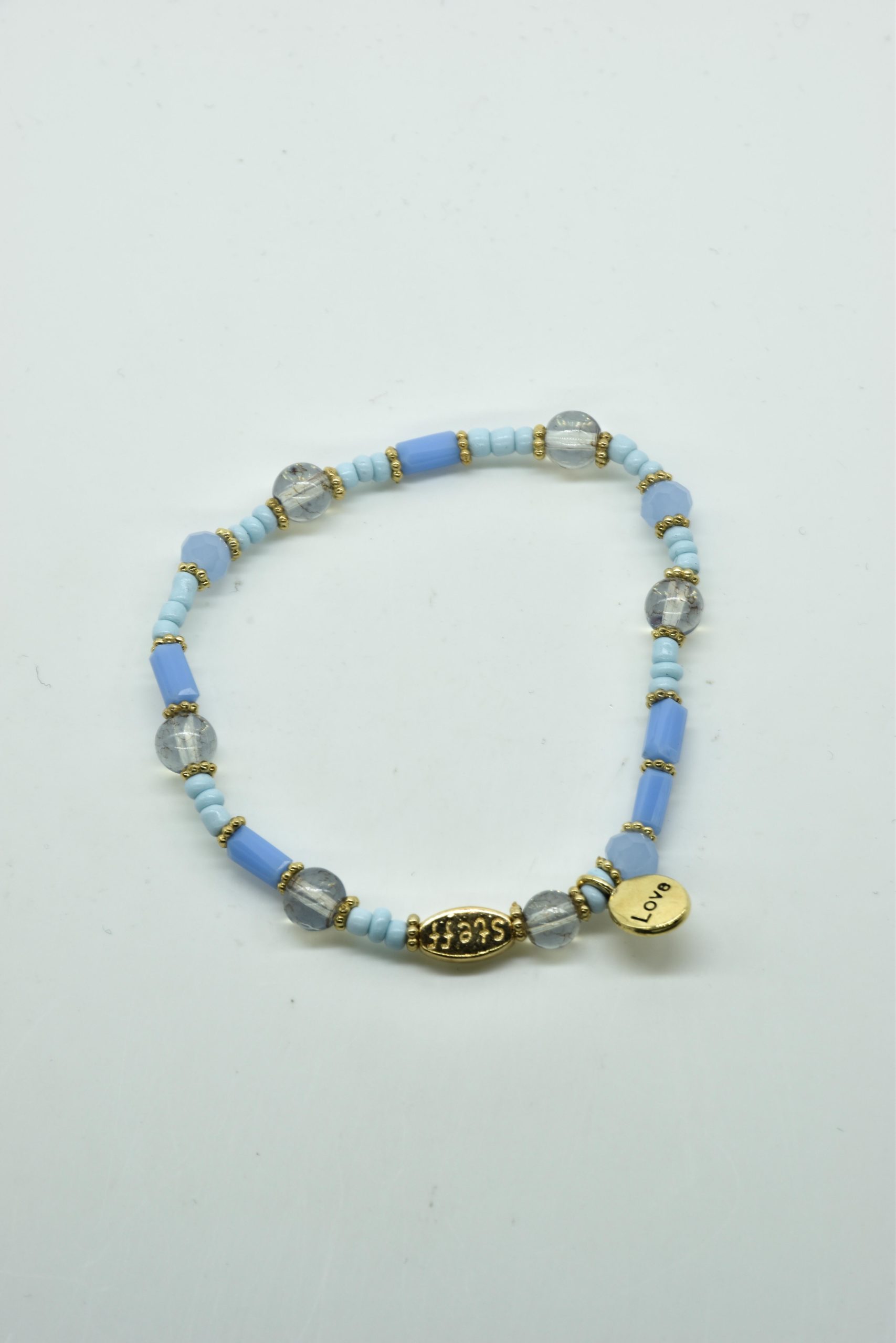 Armbandje met facet geslepen kristallen kraaltjes en rechthoekige metalen kraaltjes. 18,5 cm omtrek en geregen op sterk elastiek. Alle sieraden van Steff zijn nikkelvrij en met zorg ontworpen en samengesteld. Hel goed te combineren met andere armbandjes uit de collectie van Steff.