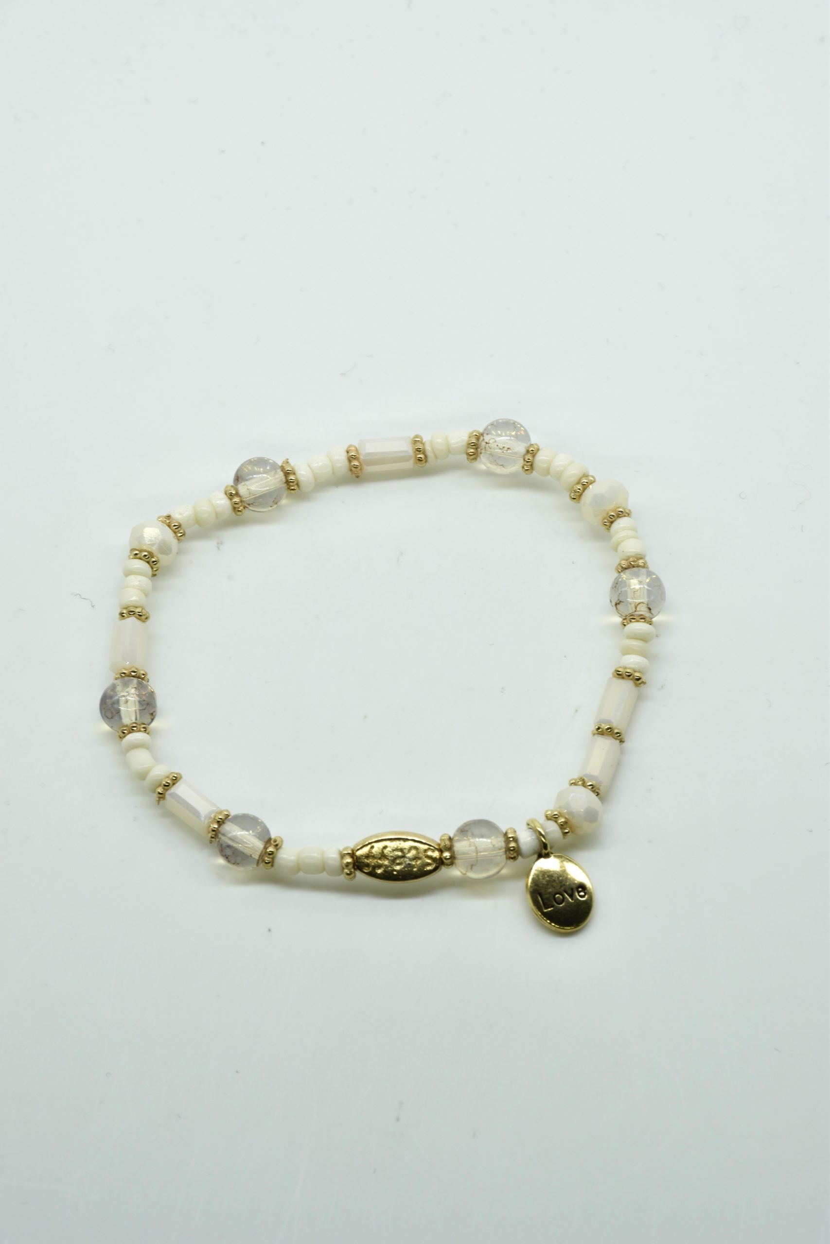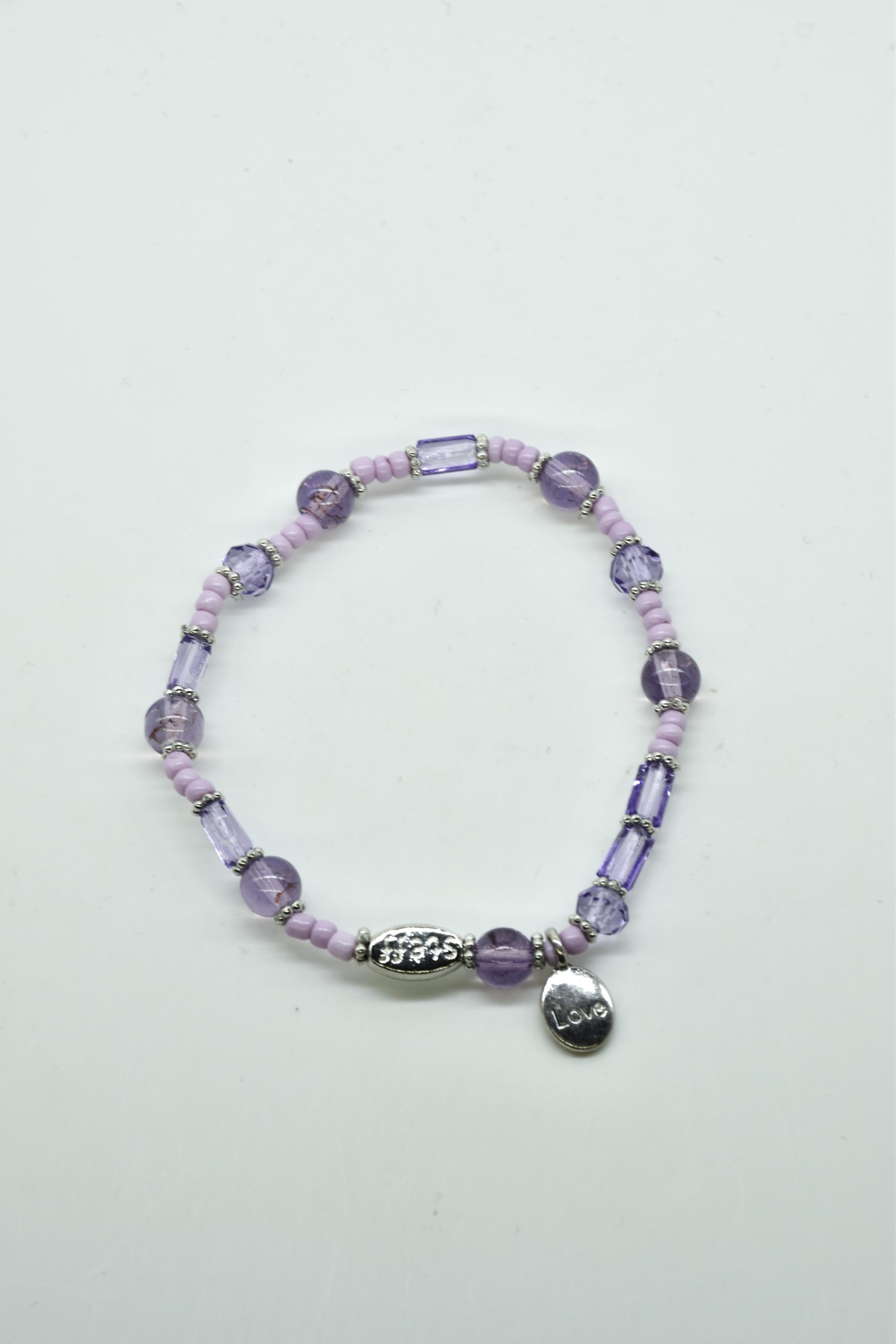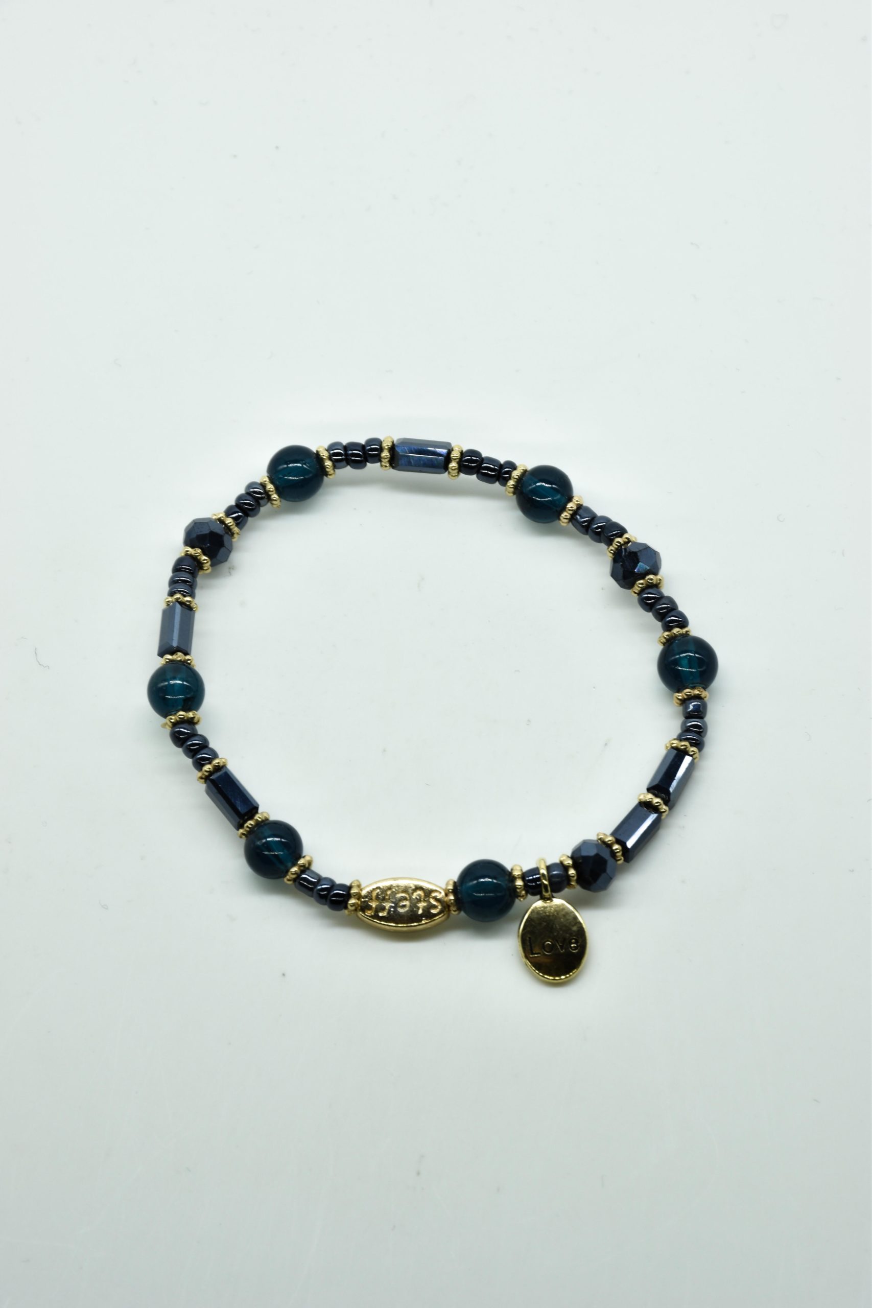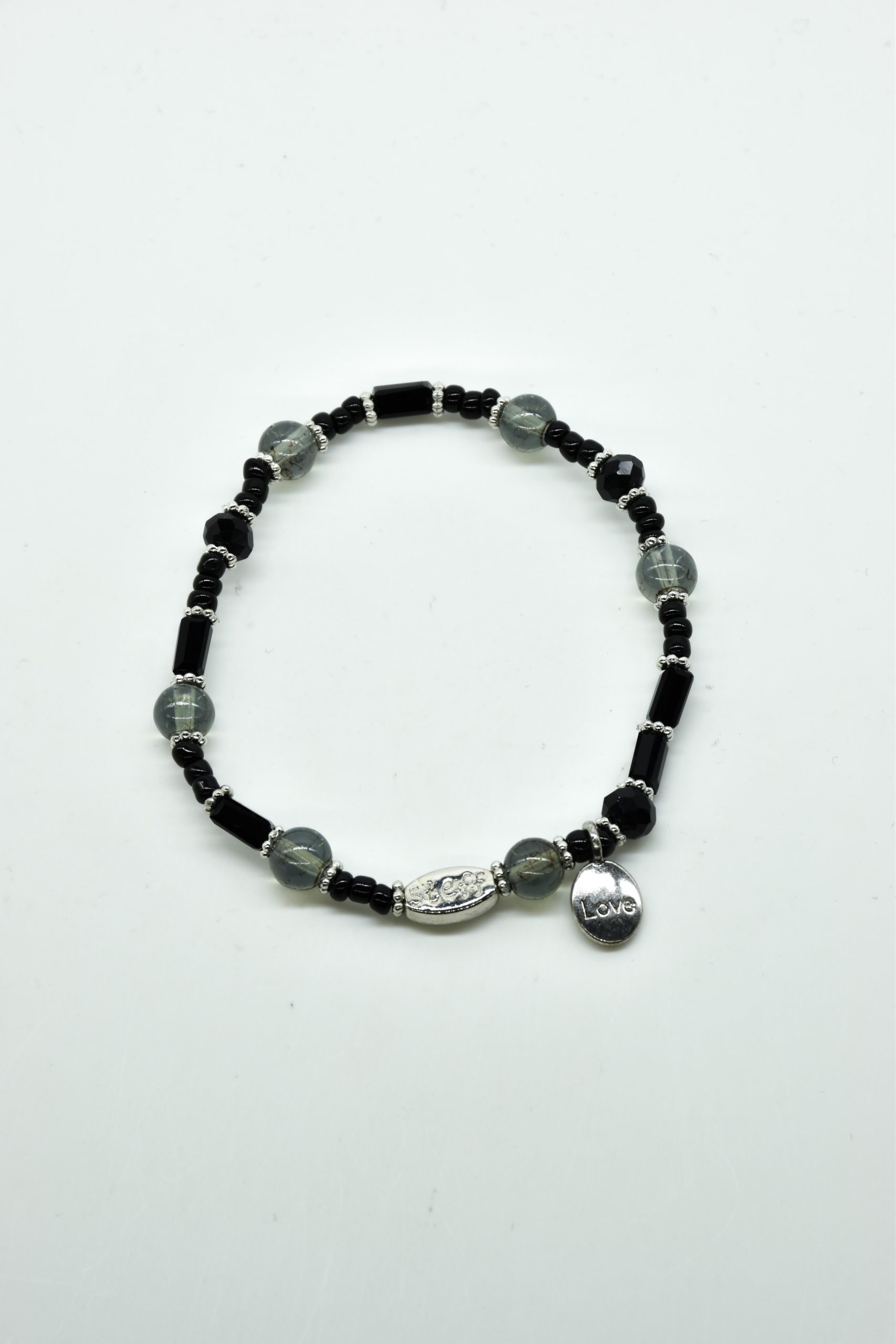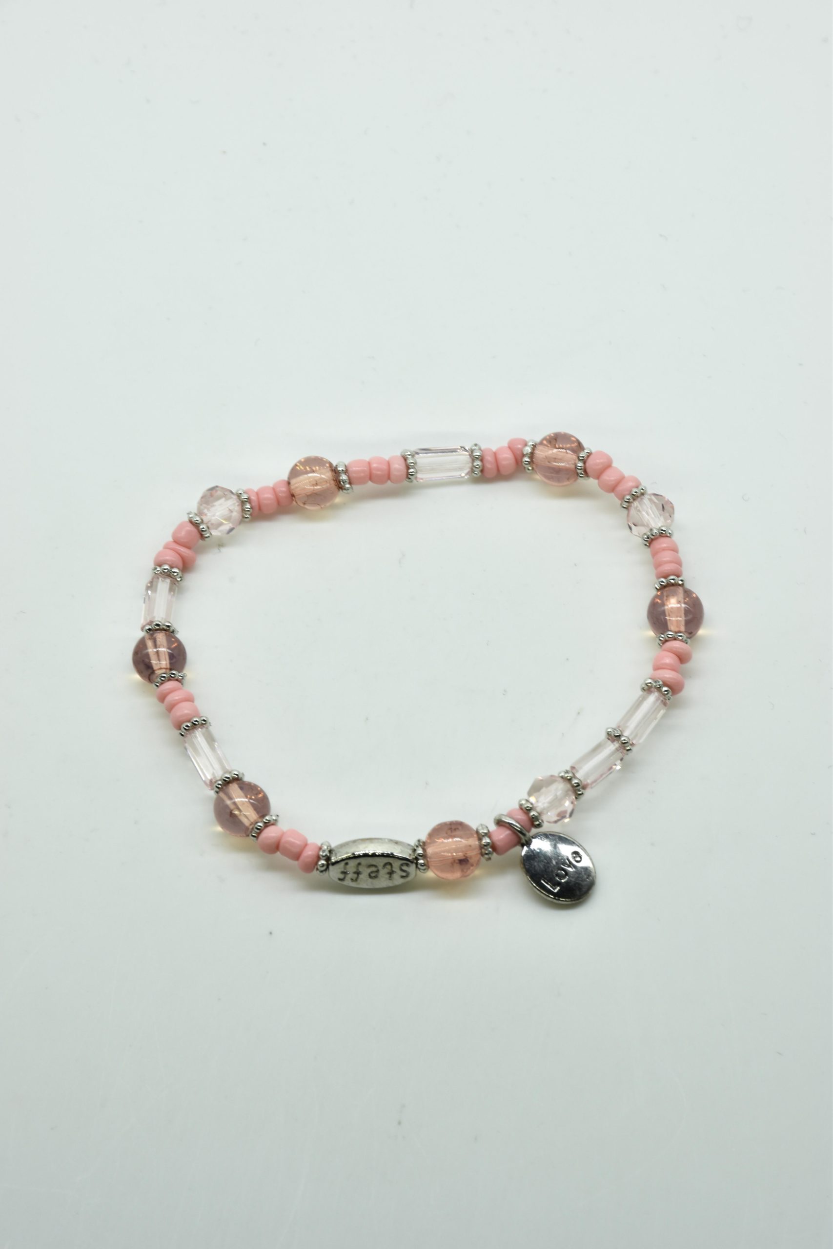 Armbandje met facet geslepen kristallen kraaltjes en rechthoekige metalen kraaltjes. 18,5 cm omtrek en geregen op sterk elastiek. Alle sieraden van Steff zijn nikkelvrij en met zorg ontworpen en samengesteld. Hel goed te combineren met andere armbandjes uit de collectie van Steff.