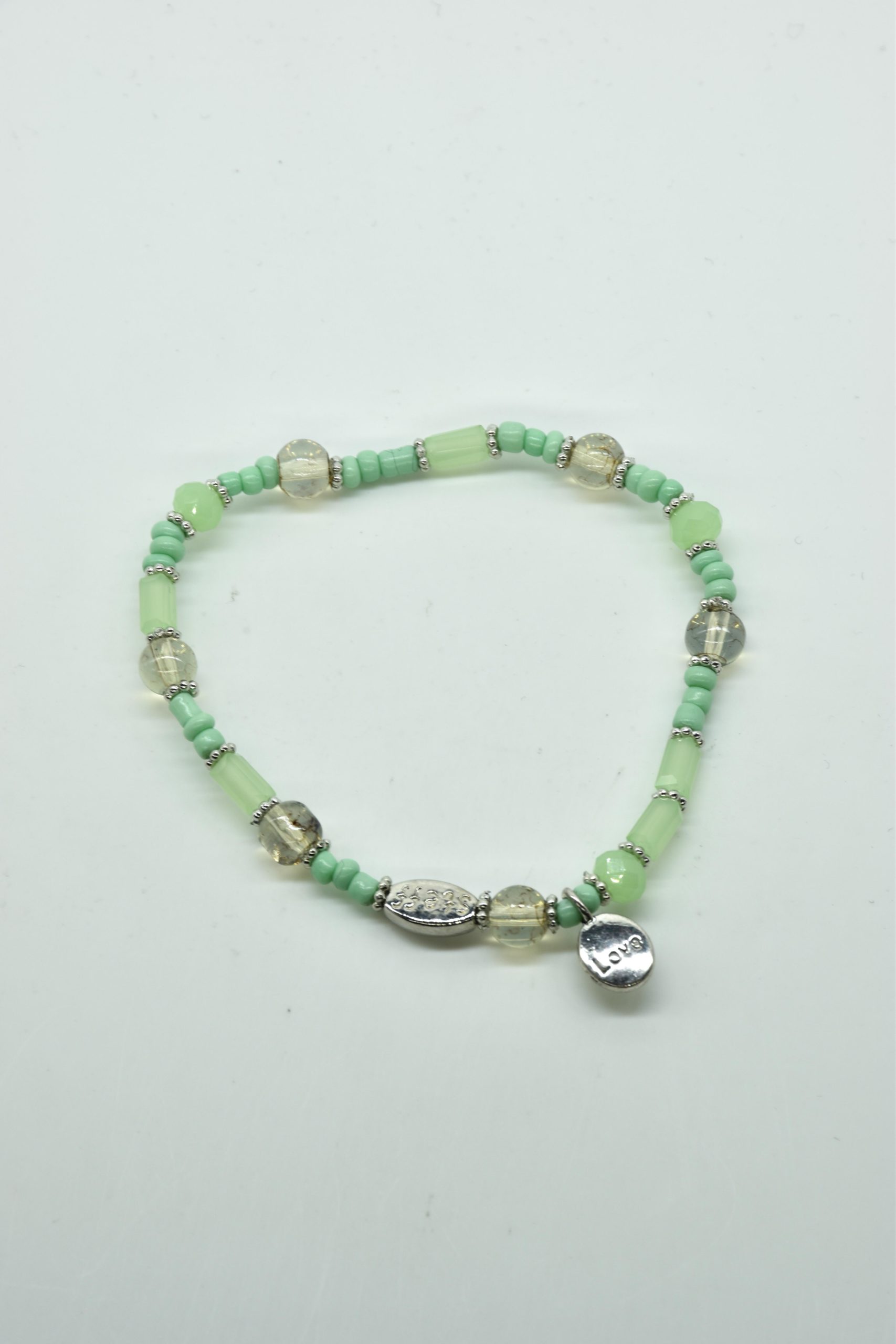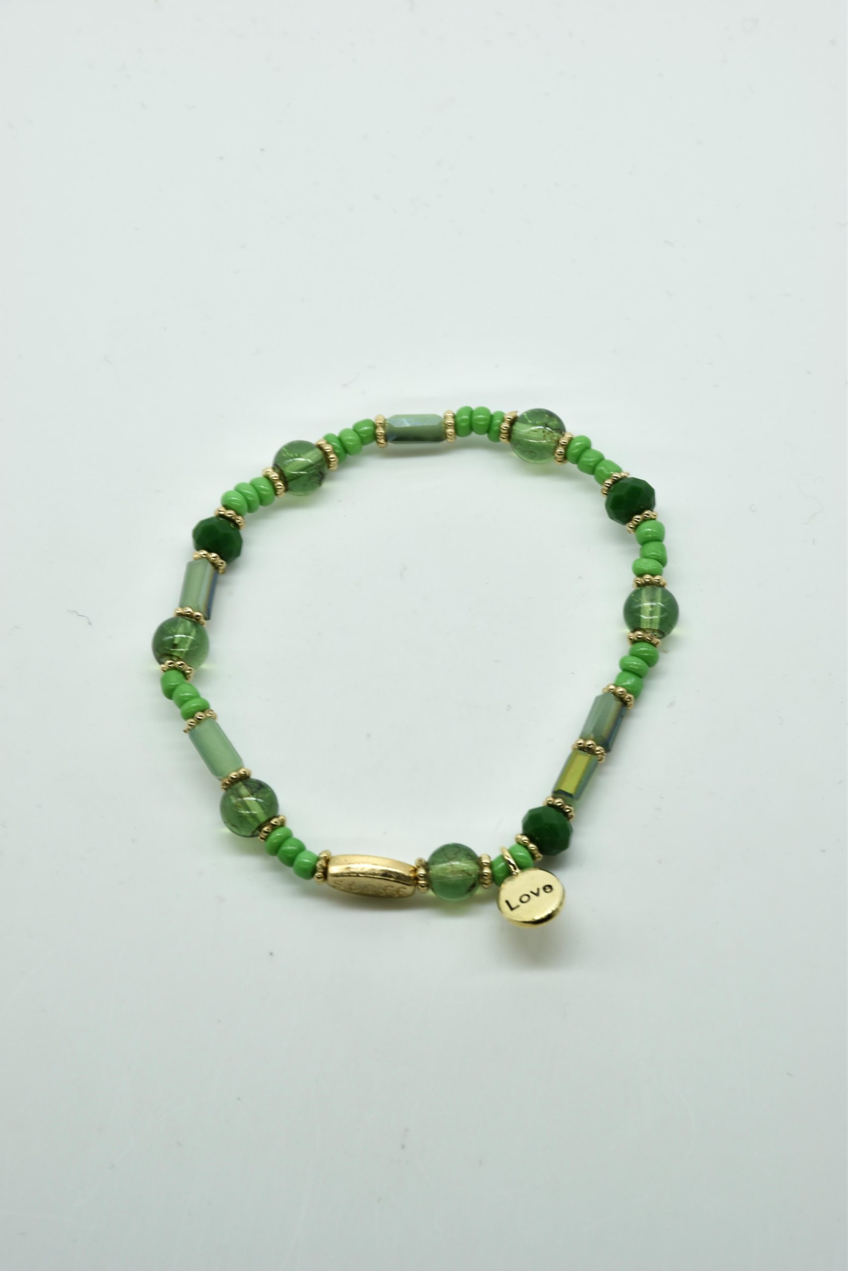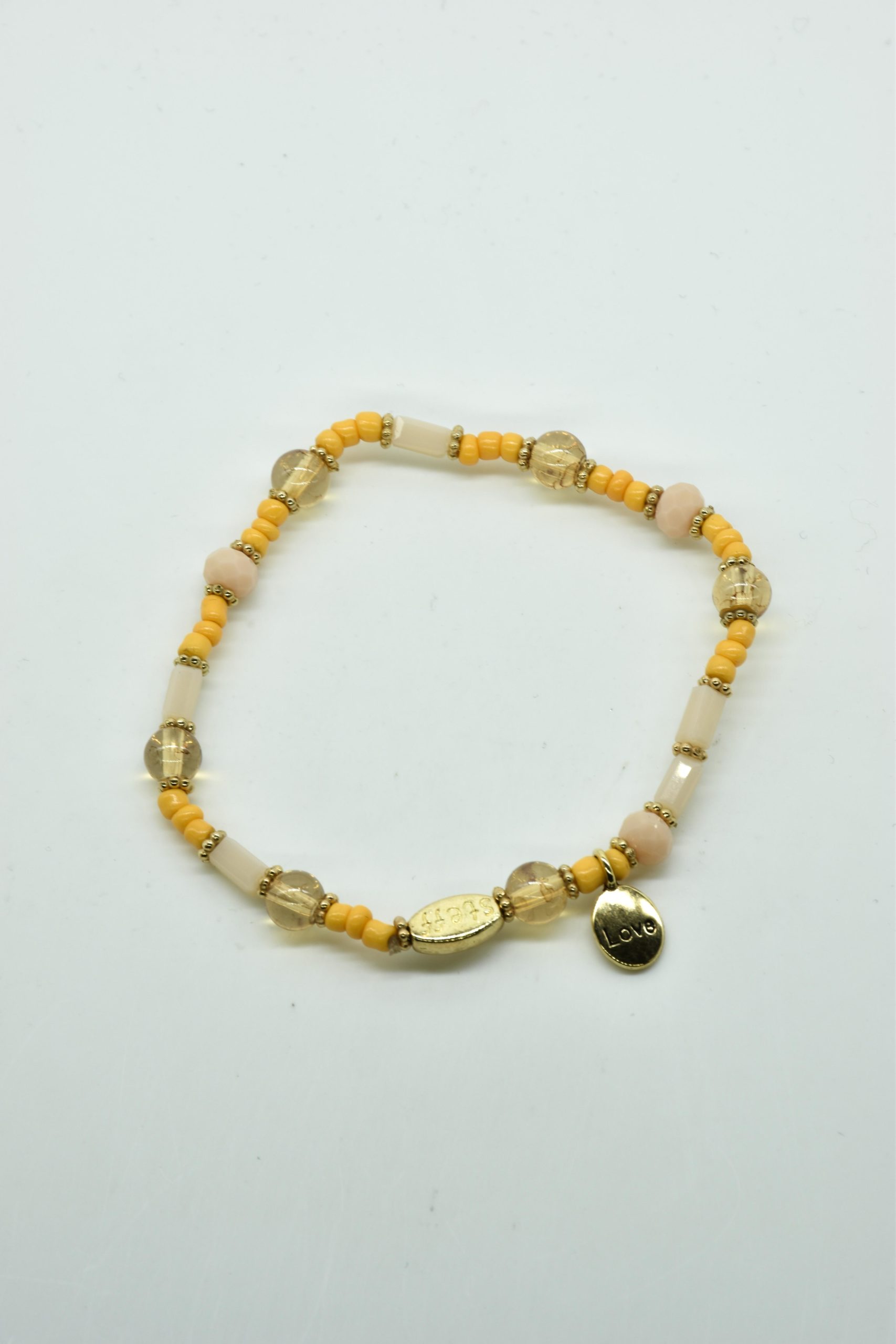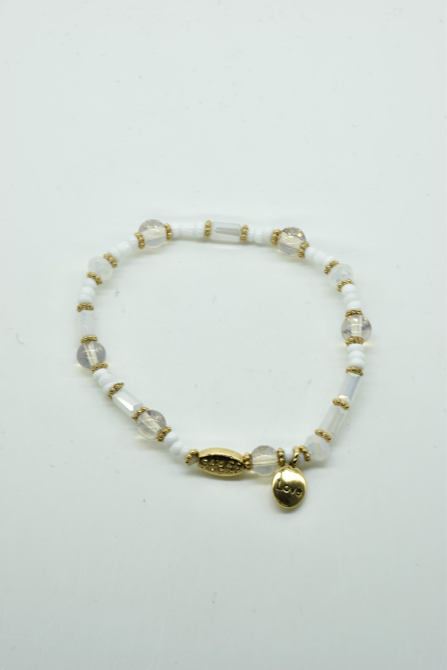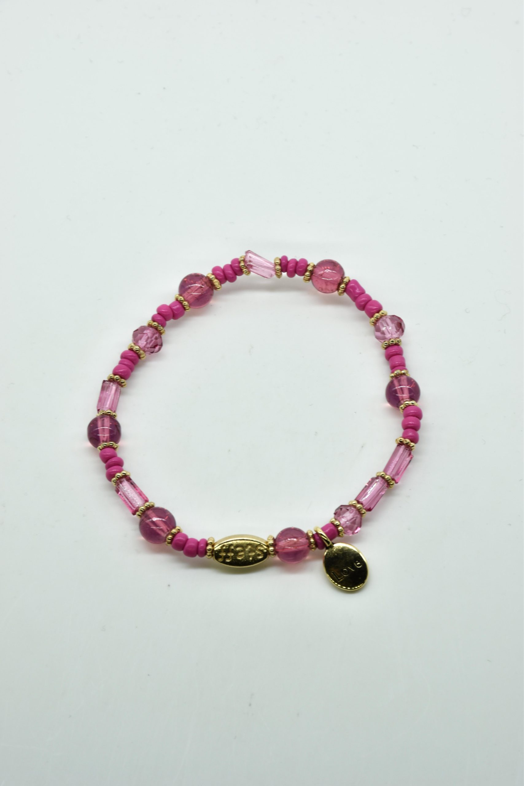Armbandje met facet geslepen kristallen kraaltjes en rechthoekige metalen kraaltjes. 18,5 cm omtrek en geregen op sterk elastiek. Alle sieraden van Steff zijn nikkelvrij en met zorg ontworpen en samengesteld. Hel goed te combineren met andere armbandjes uit de collectie van Steff.