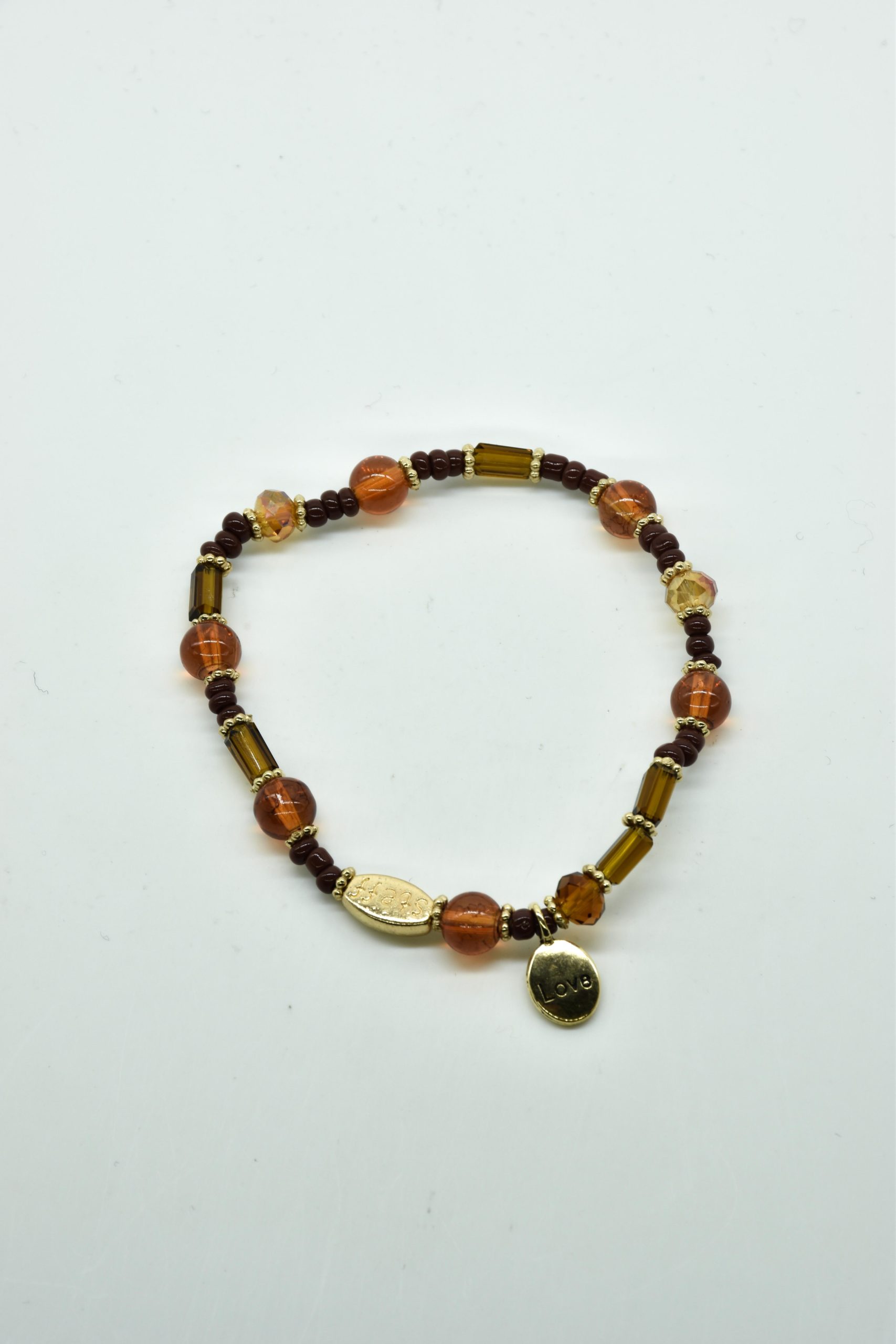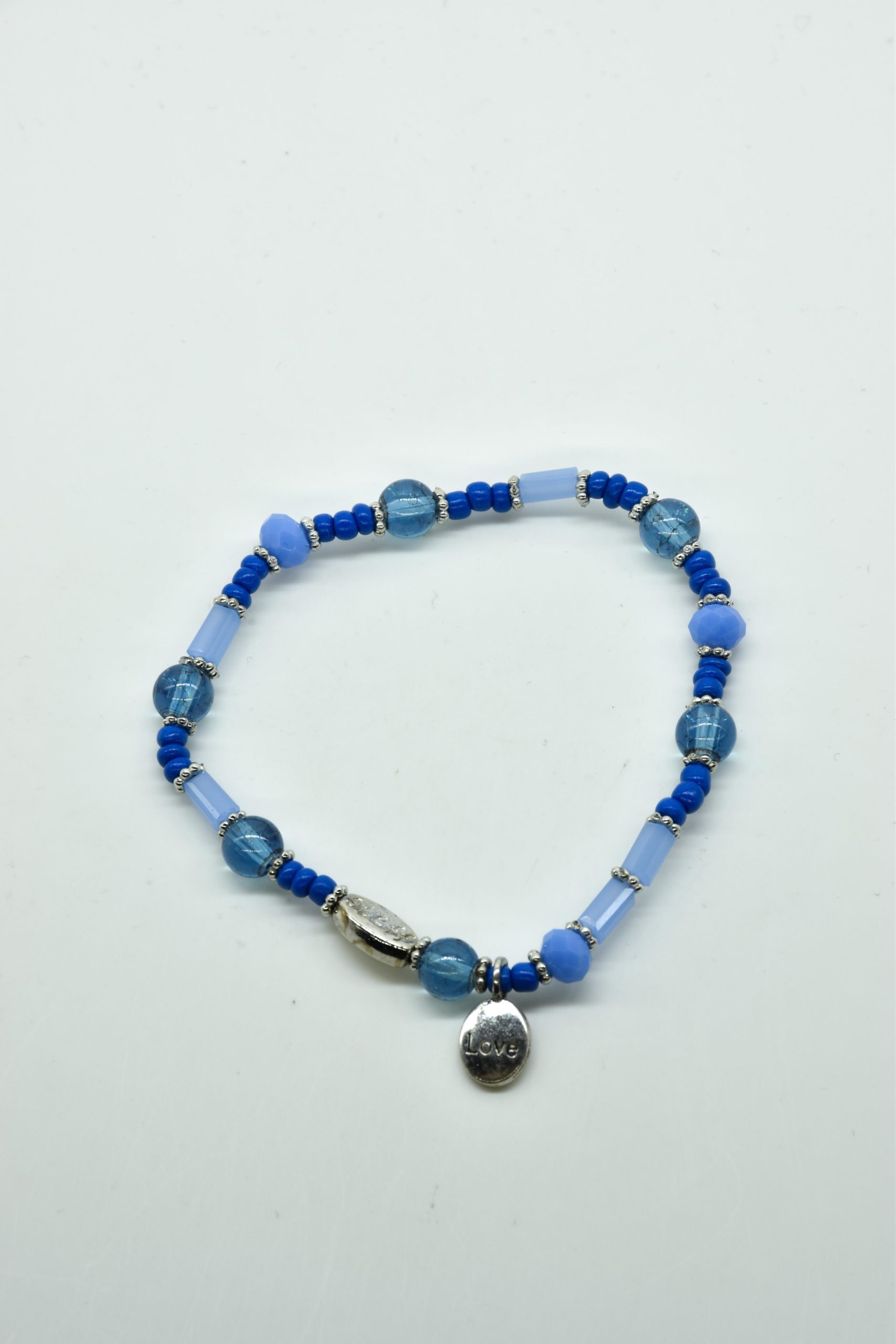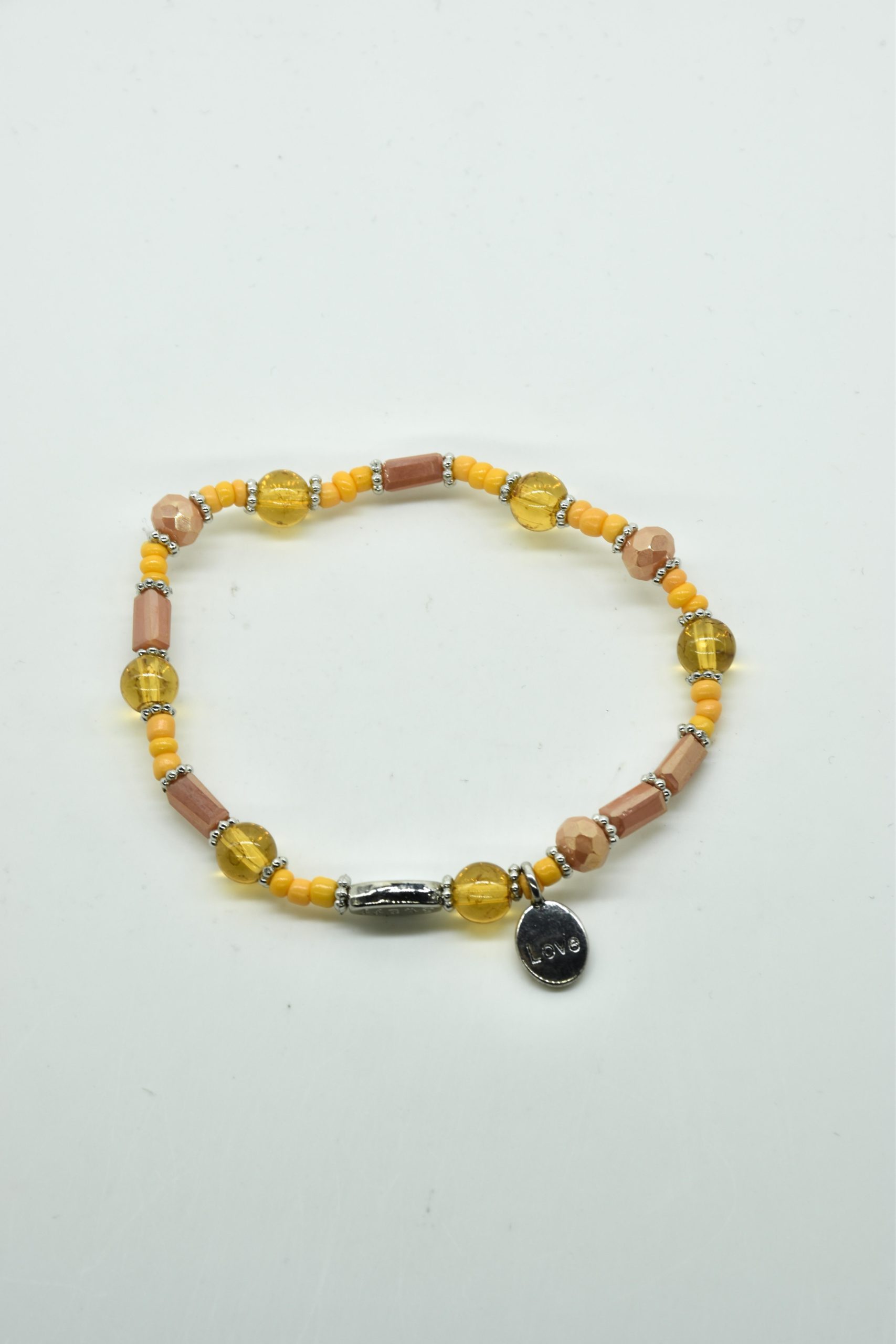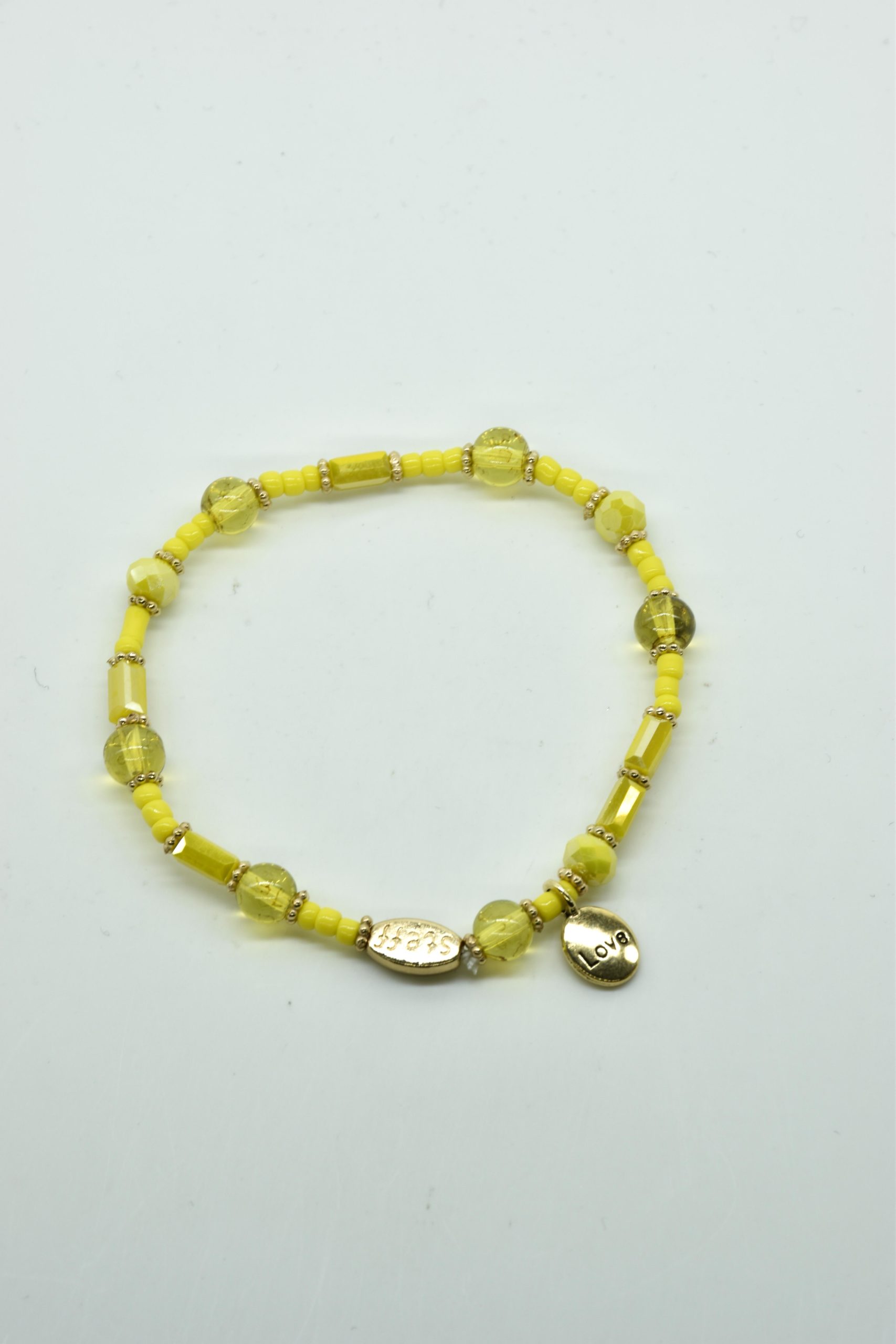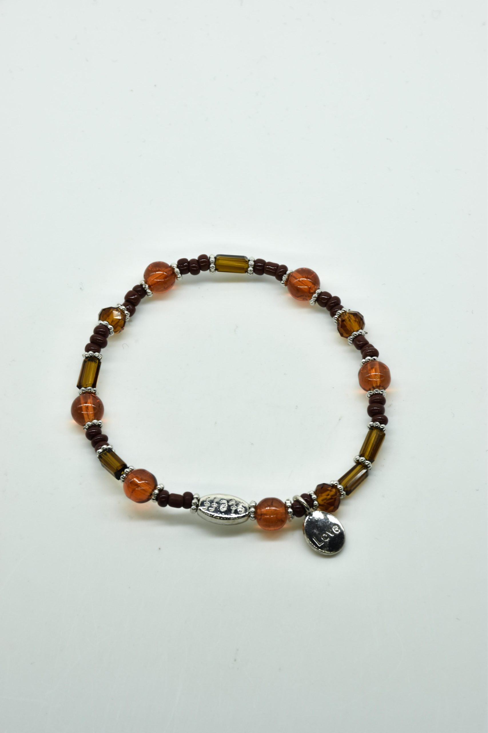 Armbandje met facet geslepen kristallen kraaltjes en rechthoekige metalen kraaltjes. 18,5 cm omtrek en geregen op sterk elastiek. Alle sieraden van Steff zijn nikkelvrij en met zorg ontworpen en samengesteld. Hel goed te combineren met andere armbandjes uit de collectie van Steff.